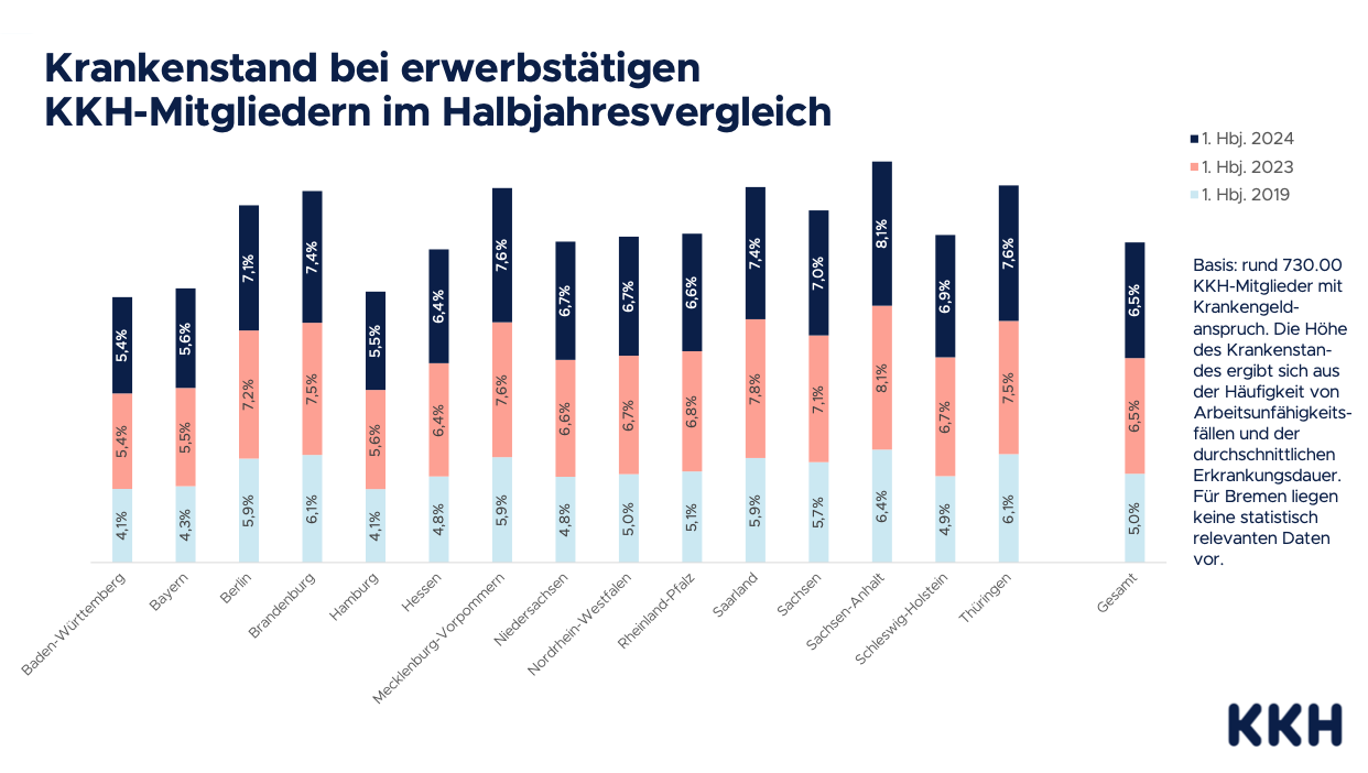 Im Ländervergleich ist das der aktuell zweithöchste Wert nach Sachsen-Anhalt (8,1 Prozent). Den niedrigsten Krankenstand für Januar bis Ende Juni 2024 verzeichnet die KKH mit 5,4 Prozent in Baden-Württemberg. Der Bundesdurchschnitt liegt bei 6,5 Prozent.