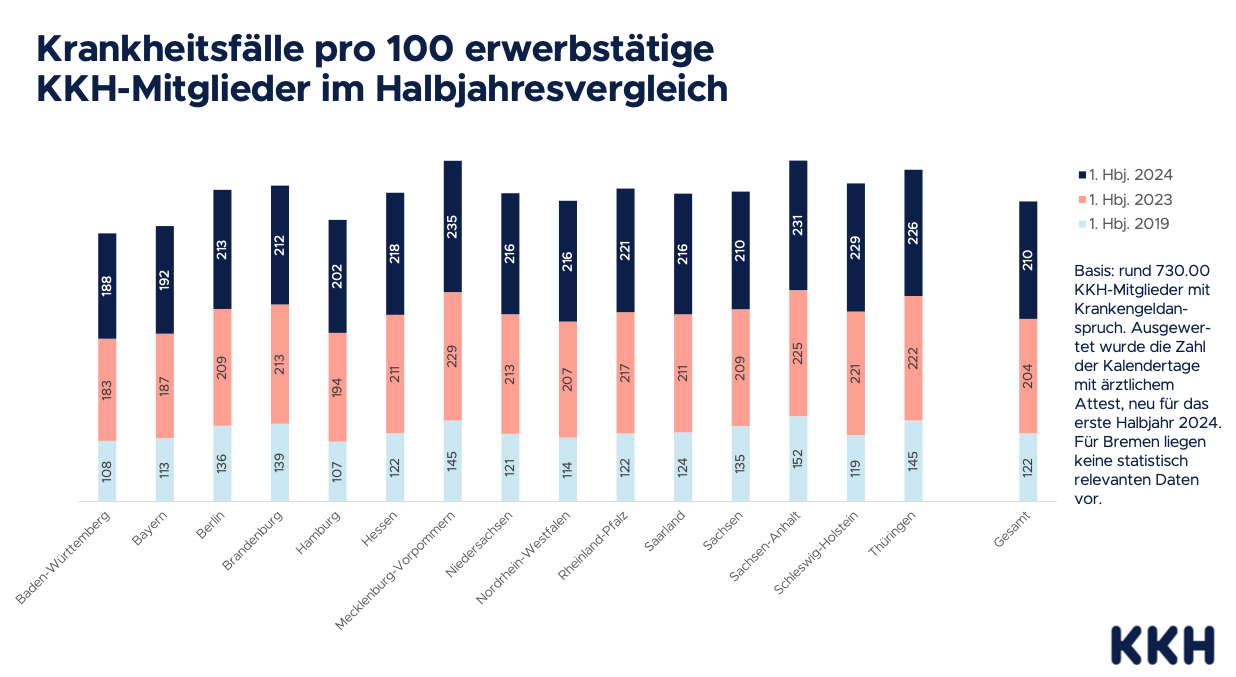Im Ländervergleich ist das der aktuell zweithöchste Wert nach Sachsen-Anhalt (8,1 Prozent). Den niedrigsten Krankenstand für Januar bis Ende Juni 2024 verzeichnet die KKH mit 5,4 Prozent in Baden-Württemberg. Der Bundesdurchschnitt liegt bei 6,5 Prozent.
