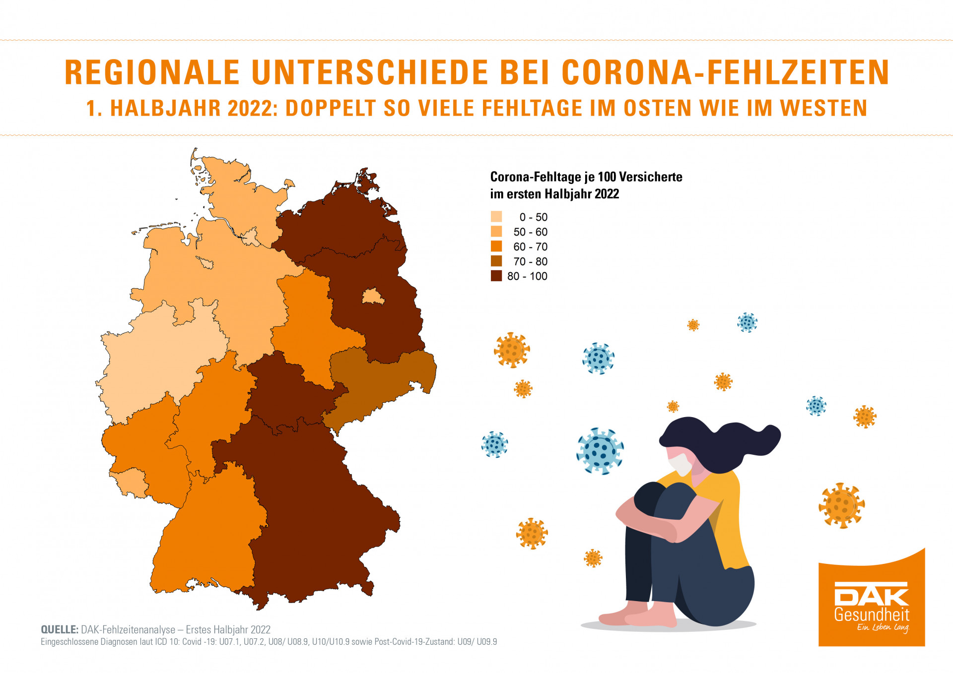Auf 100 DAK-versicherte Beschäftigte in Mecklenburg-Vorpommern kamen im ersten Halbjahr 2022 insgesamt 995 Fehltage, 159 Tage mehr als in den ersten sechs Monaten des Vorjahres. Grund für den Anstieg waren vor allem die vielen Atemwegserkrankungen. Die Anzahl der Fehltage wegen Husten und Schnupfen ging von 67 Tagen je 100 Versicherte im 1. Halbjahr 2021 auf 178 Tage hoch. Atemwegserkrankungen waren damit hinter Muskel-Skelett-Erkrankungen die zweithäufigste Ursache fürs Fehlen wegen Arbeitsunfähigkeit mit einem Anteil von 17,9 Prozent. Ausfälle wegen Corona legten ebenfalls auf nun 92 Fehltage je 100 Versicherte zu – nach knapp 13 Fehltagen mit Corona-Bezug im ersten Halbjahr 2021.