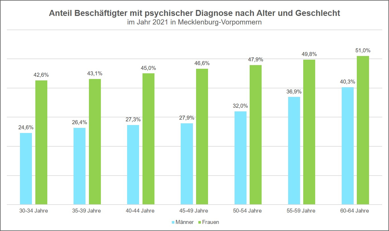 Auch Schmerz- und Belastungsstörungen treten im Nordosten häufig auf. Hiervon seien jeweils 10,6 Prozent der Beschäftigten betroffen. Deutlich öfter als in anderen Regionen gebe es in Mecklenburg-Vorpommern Suchterkrankungen. Vor allem bei Männern zeige sich vielfach ein problematischer Alkoholkonsum. So sei bei 2,8 Prozent der männlichen Beschäftigten im Nordosten eine Alkoholsucht diagnostiziert – und damit viermal häufiger als bei den weibliche Beschäftigten. Unter den Männern im Alter von 60 bis 64 Jahren litten sogar 5,7 Prozent unter einer Alkoholabhängigkeit. Die Betroffenheit liege in dieser Altersgruppe damit um siebenmal höher als bei den gleichaltrigen Frauen.