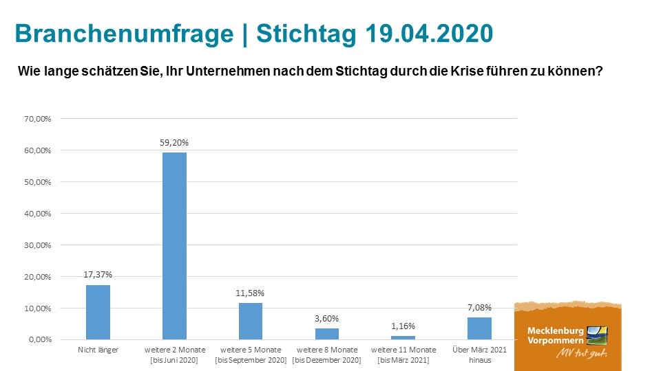Die Lage der touristischen Unternehmen in Mecklenburg-Vorpommern spitzt sich trotz staatlicher Hilfen weiter zu. Die aktuelle Branchenumfrage des Landestourismusverbandes, an der sich erneut rund 900 Unternehmen – darunter Hotels, Anbieter von Ferienwohnungen, Campingplätze, Tourist-Informationsstellen sowie Kurverwaltungen – beteiligt haben, weist die äußerst schwierige Situation für die Branche angesichts der Corona-Krise nach. Rund 60 Prozent der Befragten können ihr Unternehmen im Falle weiterer touristischer Einschränkungen über den 19. April hinaus – der nächsten Frist für das Verbot auch touristischen Reisens – maximal noch zwei Monate weiterführen; vor drei Wochen waren es noch 45 Prozent, die dies so für sich bewerteten.