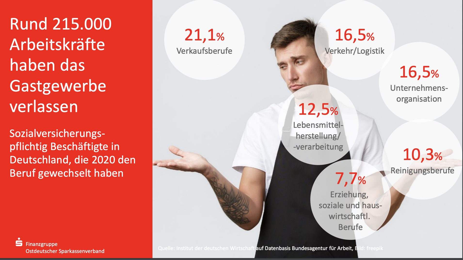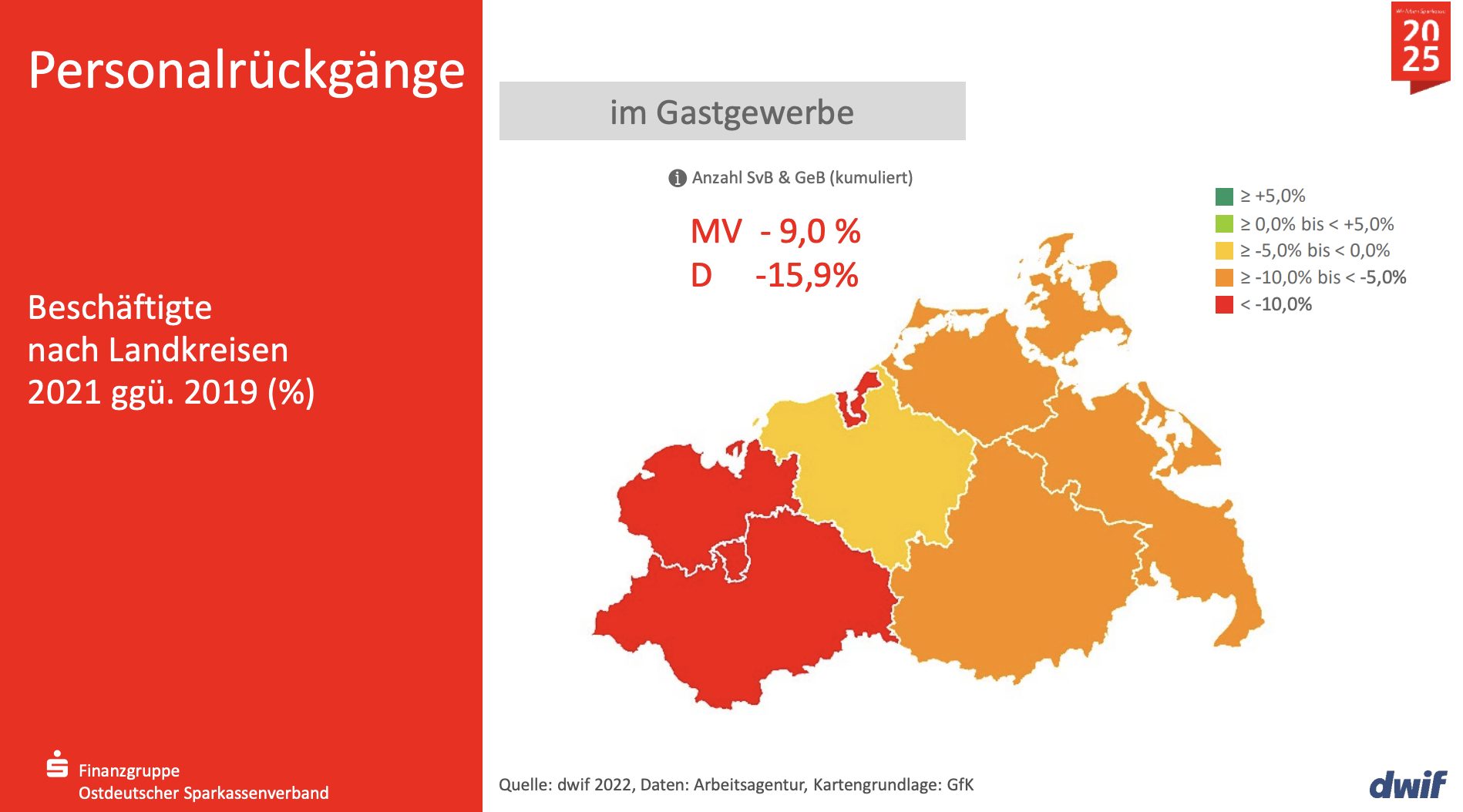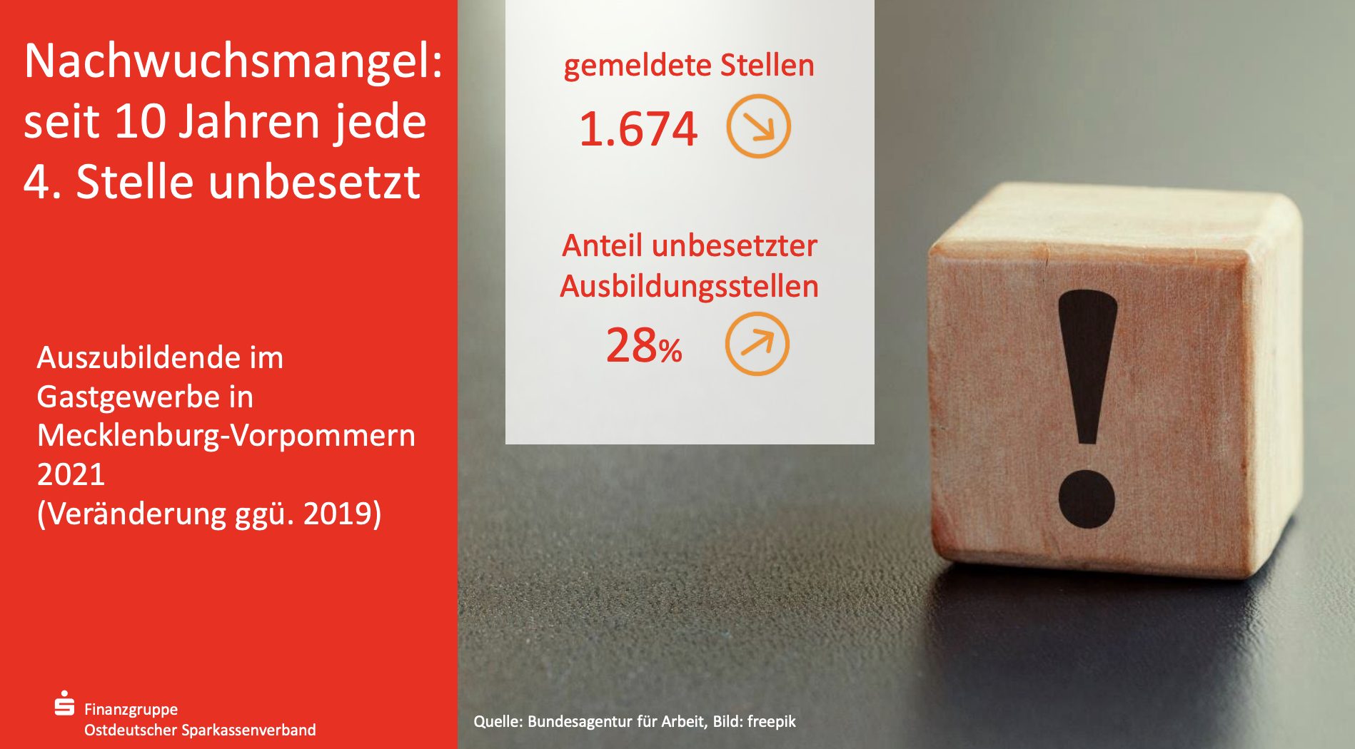Die Zahl der sozialversicherungspflichtig und geringfügig Beschäftigten im Gastgewerbe Mecklenburg-Vorpommerns hat im Jahr 2021 gegenüber dem Vor-Corona-Jahr 2019 insgesamt um 9 Prozent abgenommen, deutschlandweit sogar um 15,9 Prozent. Die gastgewerblichen Betriebe in Mecklenburg-Vorpommern meldeten im Jahre 2021 genau 1.674 Ausbildungsstellen. 28 Prozent der Ausbildungsstellen blieben unbesetzt.