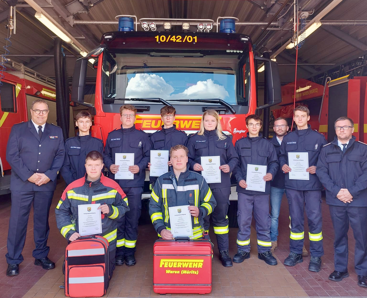 An den letzten Wochenenden haben acht junge Kameraden der Feuerwehren Waren und Schloen die Truppmann-Ausbildung Teil 1 im Warener Gerätehaus absolviert. Nach 22 Jahren fand somit erstmals wieder ein Truppmann-Lehrgang in der Warener Feuerwehr statt. Ein großer Dank der Wehrführung geht an Jan Müller, der diesen Lehrgang organisiert und durchgeführt hat. Aber auch den Zug- und Gruppenführern gilt ein großer Dank für die Ausbildung in Theorie und Praxis. Die Ausbildung in Erster Hilfe bei der Feuerwehr vermittelte der ehemalige Warener Kamerad Jens Boldt. In den nächsten zwei Jahren werden die jungen Feuerwehrleute im Ausbildungsdienst in ihren Feuerwehren die Truppmann-Ausbildung Teil 2 absolvieren.