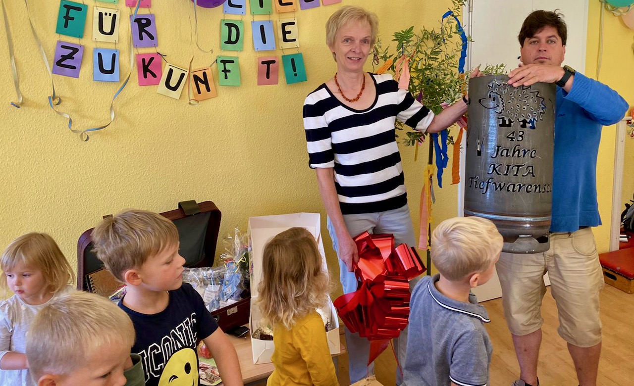 Man kennt sie in Waren, doch nur wenige sprechen Christine Lebzien mit “Frau Lebzien“ an. Sie ist einfach “Tante Christine”. Kein Wunder, denn die Warenerin arbeitete nun schon seit 43 Jahren als Erzieherin und hat in all den Jahren unzählige Knirpse betreut. Und zwar immer in der Kita am Tiefwarensee. Vor 43 Jahren startete die heute 62-Jährige in diesem Beruf. Doch jetzt hat sie Tschüss gesagt. „Tante Tine“ ist am Freitag als Leiterin der beliebten Einrichtung verabschiedet worden. Kinder, Erzieher und Eltern hatte einige Überraschungen für die Warenerin vorbereitet.