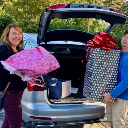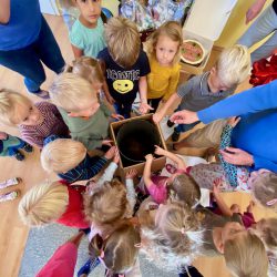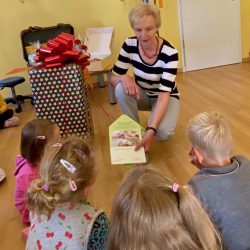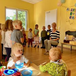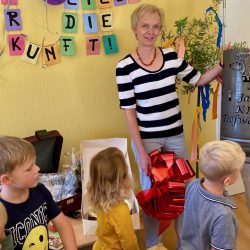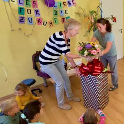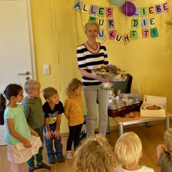 Alle Kinder und Erzieher warten gespannt im Gruppenraum auf Christine, dann kommt sie herein….Lieder werden angestimmt, und auch ein paar Tränen fließen. Die Kinder haben mit den Erzieherinnen Geschenke vorbereitet, von den Eltern gibt es eine handgemachte Feuertonne.