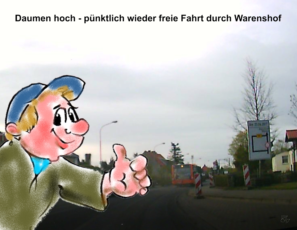 Da kann man auch mal loben, meint unser Zeichner Joachim Kluge: Die Arbeiter haben die neue Fahrbahndecke in der Warendorfer und Schwenziner Straße in Waren am gestrigen Sonntag tatsächlich geschafft.