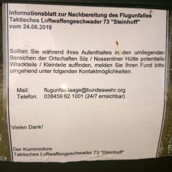 Und in Nossentiner Hütte und Silz stehen auch noch kleine Bundeswehrcontainer an den Feuerwehren. Dort sollen ehrliche Finder Teile hineinwerfen, von denen sie denken, dass sie zu den zerstörten Flugzeugen gehören können. In einem der Container sind auch etliche Metallteile zu erkennen, die von den Eurofightern stammen dürften. „Wir rechnen sowieso damit, dass auch im Herbst noch Teile auftauchen, wenn die Pilzesammler unterwegs sind“, sagte Hartwig Kurth aus Nossentiner Hütte.