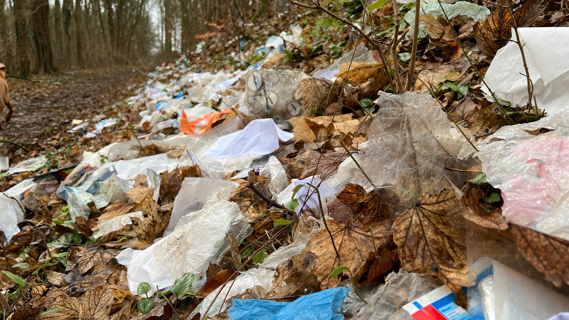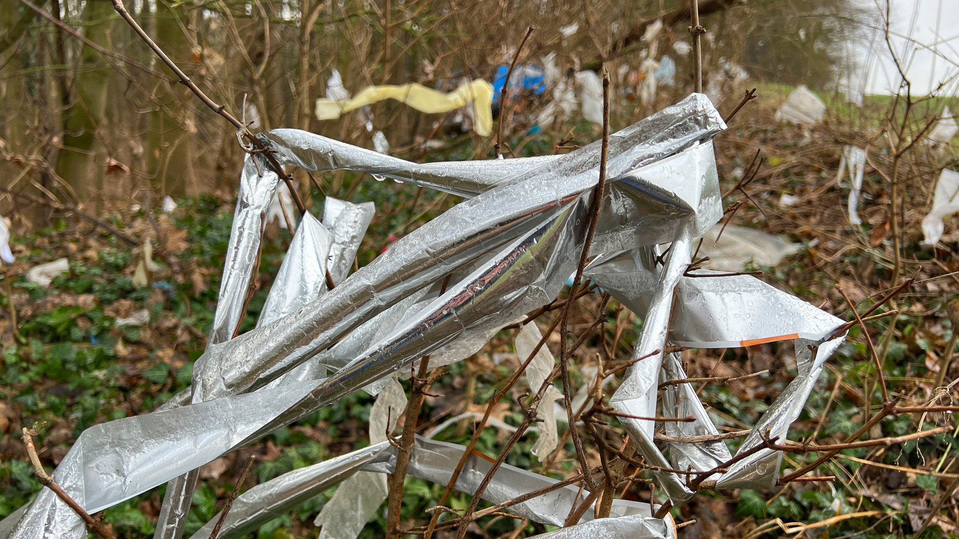 Auf dem Waldboden und hoch in den Bäumen – überall Folienreste, Papiere und Styroporfetzen. „Immer wenn Sturm ist, fliegen die Müllabfälle über das Feld in Richtung Wäldchen und Wasser“, sagt Köppe. Er geht hier mehrmals am Tag mit seinem Hund spazieren und sieht genau, was hier passiert oder eben nicht.