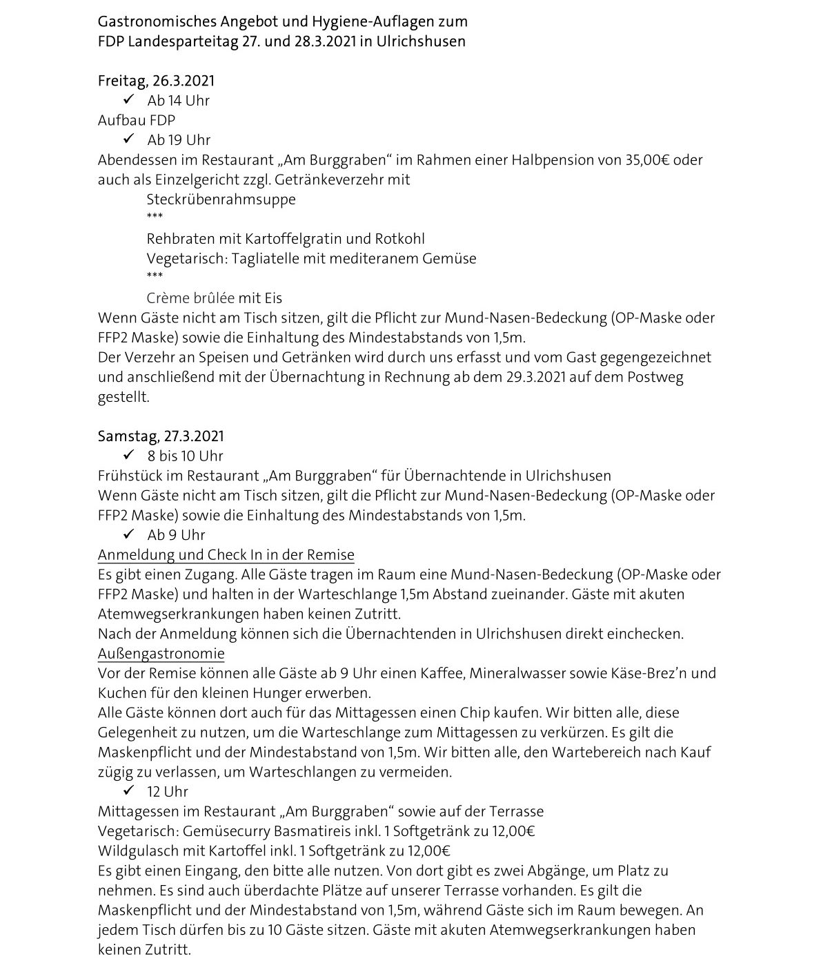 Brigitte Rehfeldt hat sich jetzt in einem offenen Brief an René Domke gewandt. Diesen Brief veröffentlichen wir hier. Und da der Spitzenkandidat öffentlich meinte, dass es ja nur Wildgulasch gegeben habe, zeigen wir in diesem Beitrag zudem den Verpflegungsplan, den die Liberalen auf ihrer eigenen Homepage präsentierten.