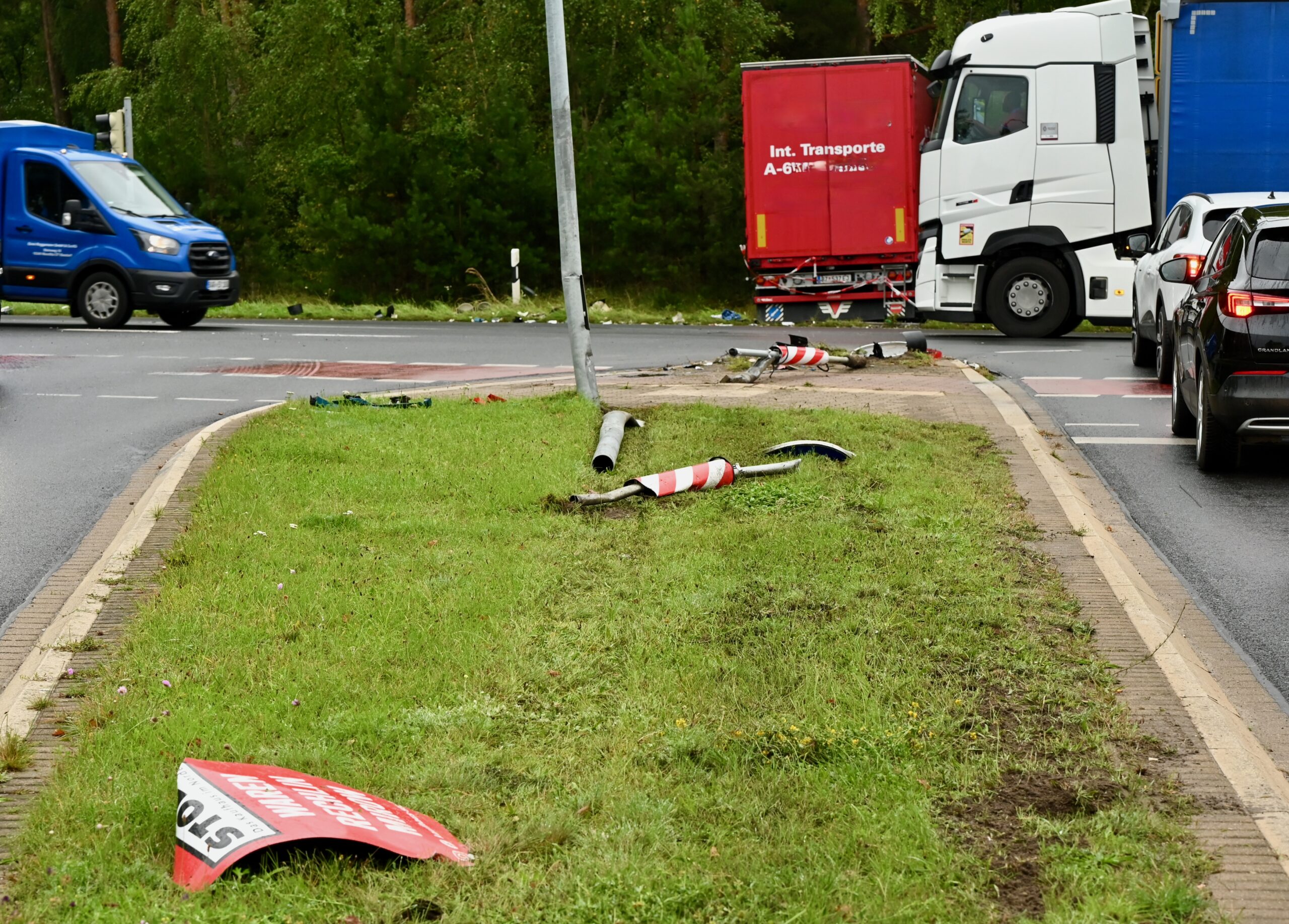 Schwerer Unfall heute früh gegen 3.45 Uhr in der Warendorfer Straße in Waren. Ein 40 Jahre alter rumänischer Fahrer geriet mit seinem Lkw in den Gegenverkehr und kollidierte dort mit einem Auto. Anschließend schoss der Lkw über eine Kreuzung und landete im Wäldchen. Im Pkw befanden sich der 59 Jahre alte Fahrer ein gleichaltriger Beifahrer. Er musste von der Feuerwehr aus dem Wrack befreit und dann in ein Krankenhaus gebracht werden. Laut Polizei gilt er zunächst als leicht verletzt. Der Lkw hat auf einer Strecke von etwa 200 Metern eine Schneise der Verwüstung hinterlassen: umgefahrener Schilder und Ampeln lagen überall verstreut. Nach Informationen von „Wir sind Müritzer“ war der Fahrer des Lasters nackt und soll noch vor dem Eintreffen der Polizei auf andere Autos eingeschlagen haben. Die Beamten fanden ihn in einem psychischen Ausnahmezustand vor, mussten ihn zu Boden bringen und fesseln. Ein erster Drogentest verlief positiv. Auch er kam in ein Krankenhaus. Den entstandenen Schaden gibt die Polizei mit rund 40 000 Euro an, die Bergung des Lasters hat für erhebliche Verkehrsbehinderungen gesorgt. Warens Feuerwehr war mit knapp 30 Kameraden vor Ort, unterstützte nicht nur bei der Versorgung der verletzten Beifahrerin, sondern half auch beim Aufräumen.