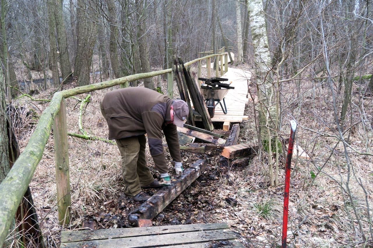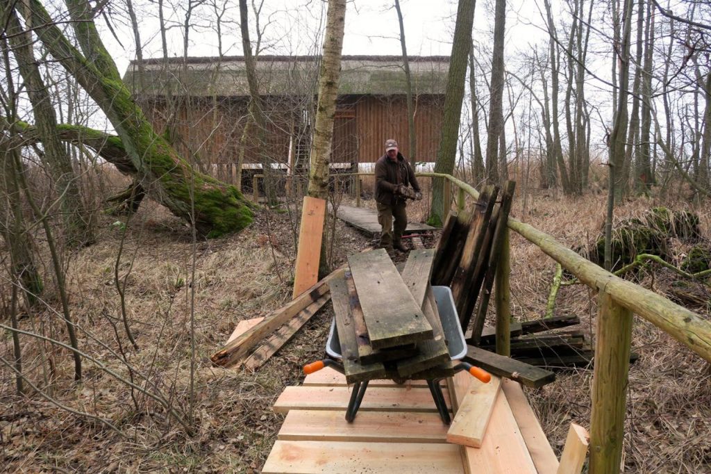 Bilder: Detlef Drevs, Mitarbeiter des Nationalparkamtes Müritz, beplankt den Bohlensteg zum Rederangsee.