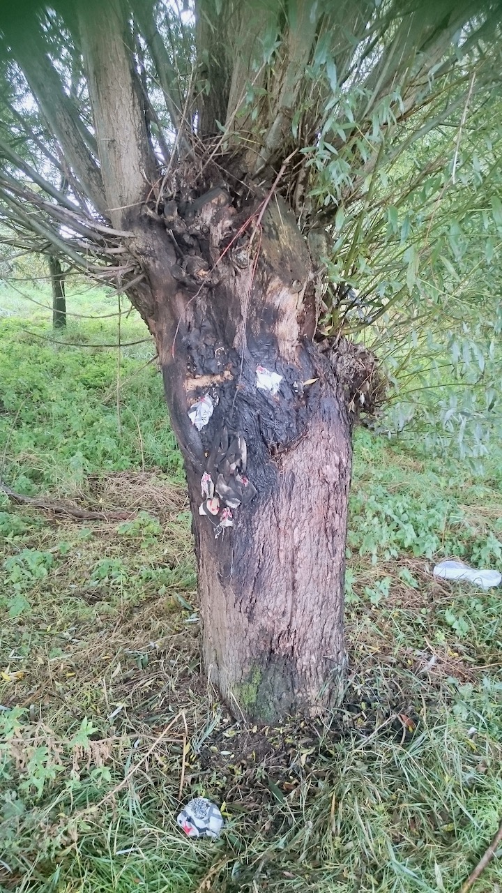 Doch damit nicht genug. Als es vermutlich nur noch räucherte nahm/ -en der oder die Unbekannten Folie und umwickelten den Baum mehrlagig.