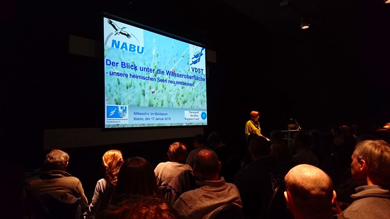 Die gute Nachricht zuerst: Der Müritz geht es auch unter Wasser gut und sie ist vielfältiger als beispielsweise die Schweriner Seen. Das hat die erfahrene Naturschutztaucherin Silke Oldorff vom Naturpark Stechlin-Ruppiner Land festgestellt. Bei einem mehrtägigen Tauchausflug auf der Müritz haben sie und ihre Naturschutztaucher im September so viele interessante Unterwasserbilder geschossen, dass daraus und mit Bildern aus anderen Seen der Mecklenburgischen Seenplatte ein kompletter Abendvortrag zur Unterwasserfauna und -flora wurde, für den mehr als 120 Interessierte ins Müritzeum kamen.