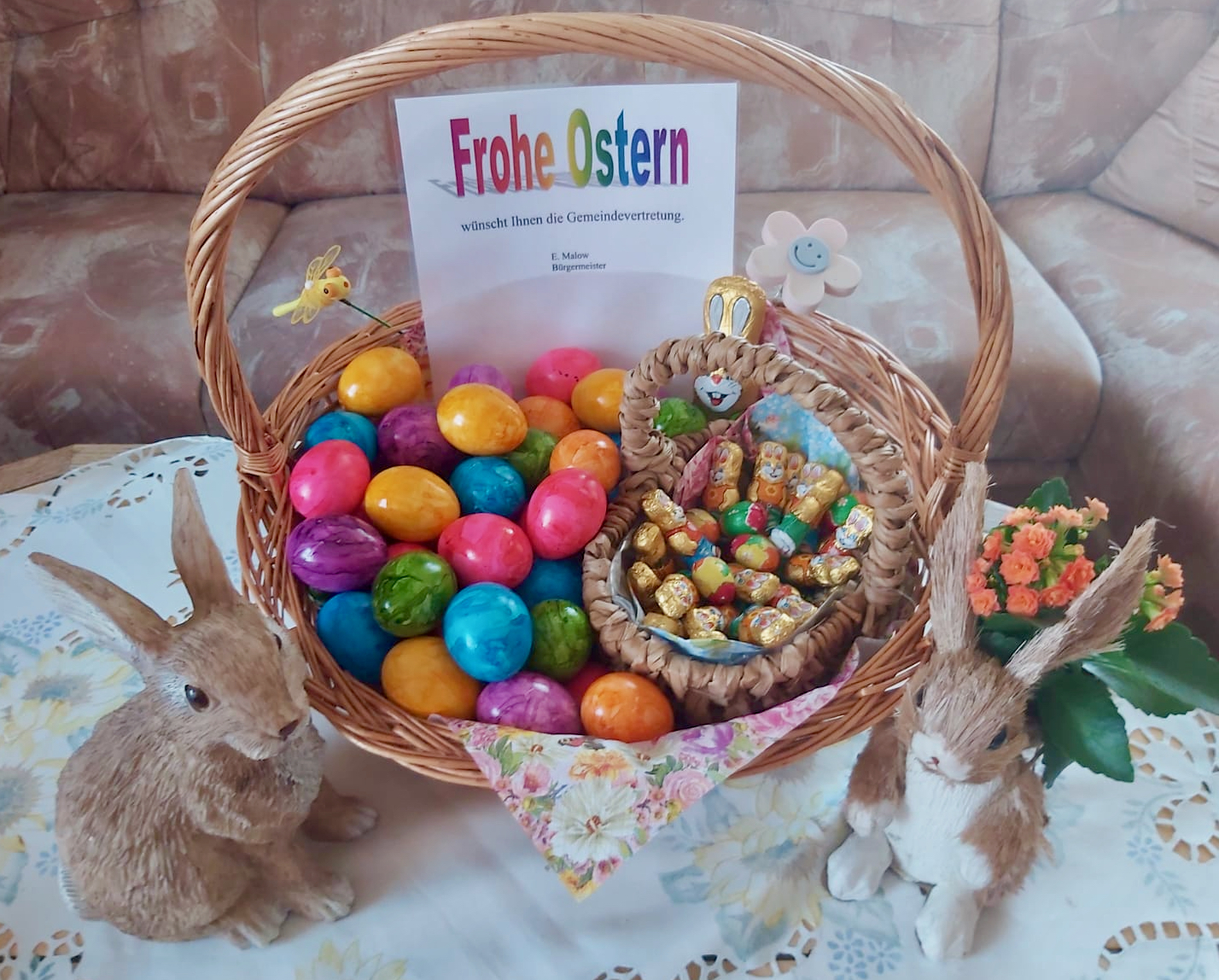 Bürgermeister Enrico Malow und die Gemeindevertreter haben gefärbte Eier und Süssigkeiten auf Körbe verteilt und stellen sie in ihren Orten an den Wegesrand. So kann sich jeder Spaziergänger bedienen.