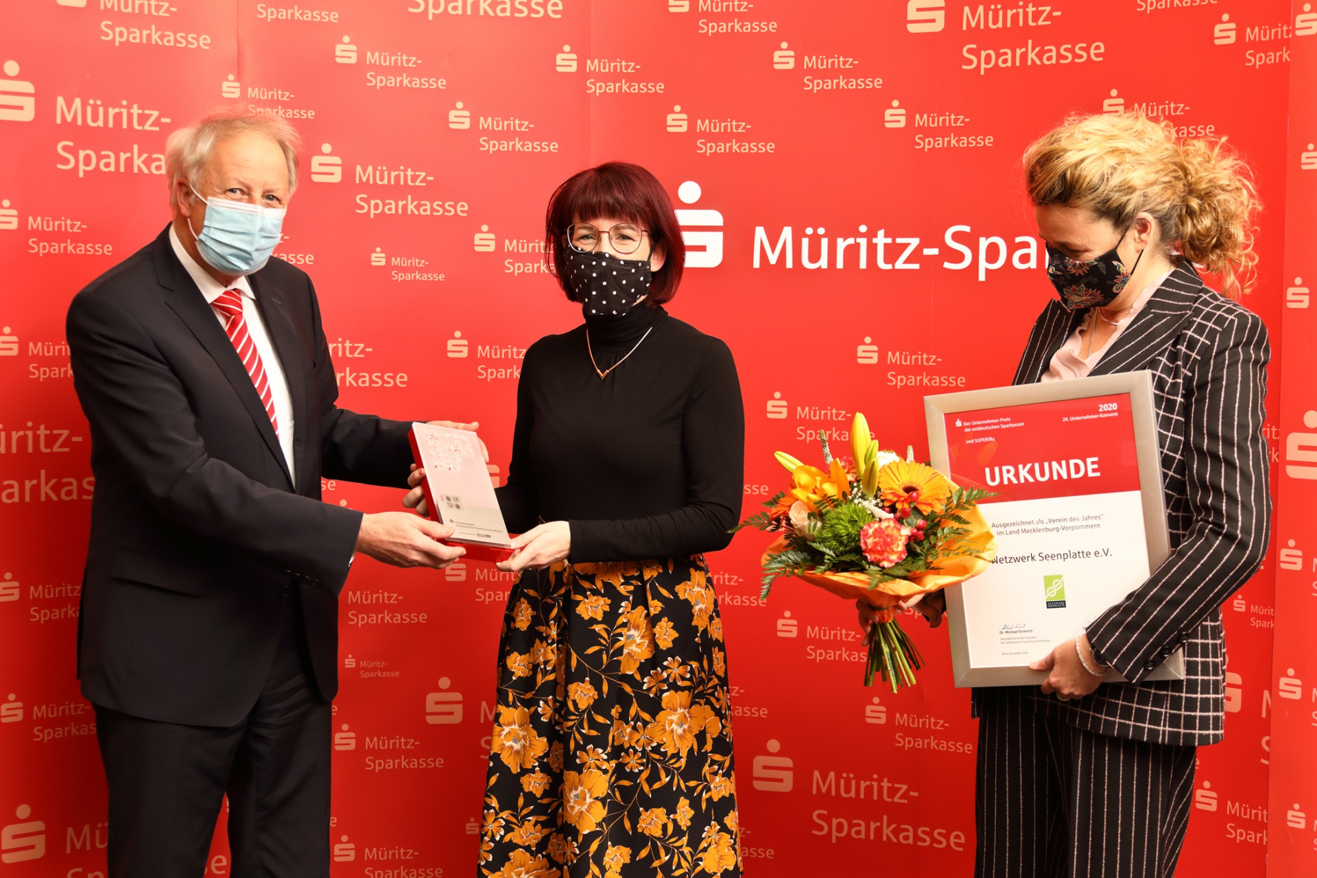 Bild: Dr. Michael Ermrich, Geschäftsführender Präsident des OSV, Judith Kenk, Verein Netzwerk Seenplatte e. V. und Andrea Perlick, Vorstandsvorsitzende der Müritz-Sparkasse
