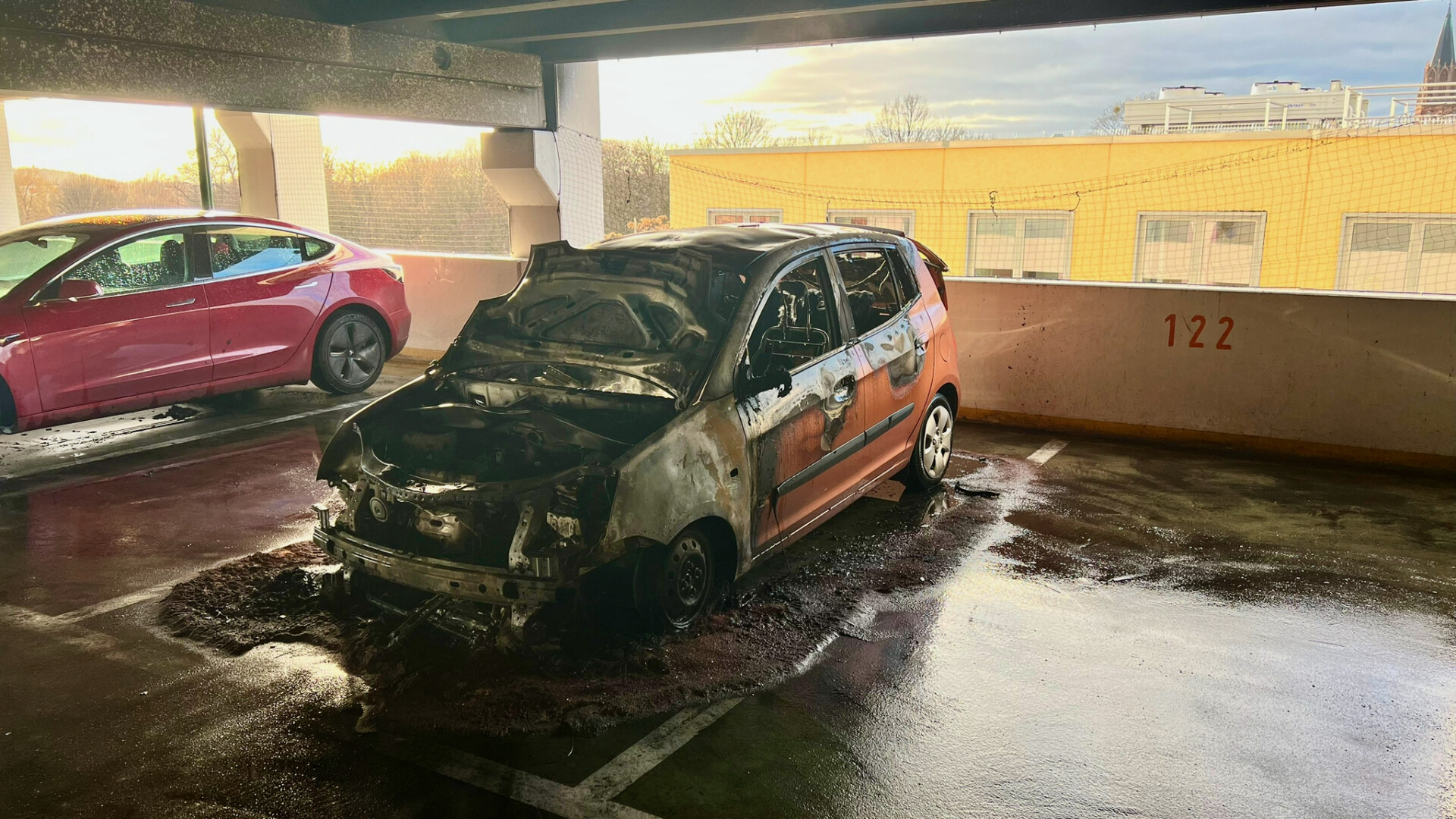 Der Fahrer stellte seinen Wagen sofort ab und öffnete die Motorhaube, um nachzuschauen. In der weiteren Folge fing der KIA aus bislang unbekannter Ursache Feuer. Ein technischer Defekt kann derzeit als Brandursache nicht ausgeschlossen werden. Aufgrund des Feuers und der starken Hitzeentwicklung wurden zudem die Fassade des Parkhauses und ein neben dem KIA abgestellter Tesla beschädigt. Verletzt wurde zum Glück niemand. Der entstandene Sachschaden wird vorerst auf ca. 6.000 Euro geschätzt.