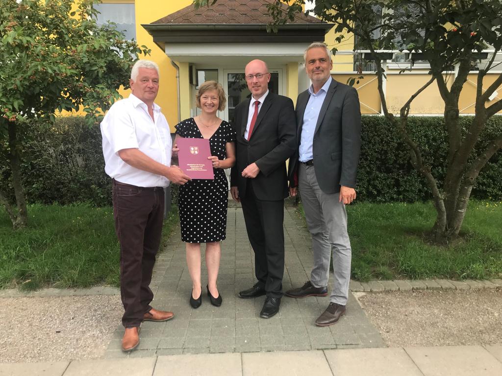 Foto: Bauminister Christian Pegel (3.v.links) hat gestern den Fördermittelbescheid an WWG-Vorstand Mike Albrecht (l.) und Vorstandsmitglied Britta Drewianka-Dahlheim übergeben. Mit dabei Andreas Breitner vom Verband Norddeutscher Wohnungsunternehmen.