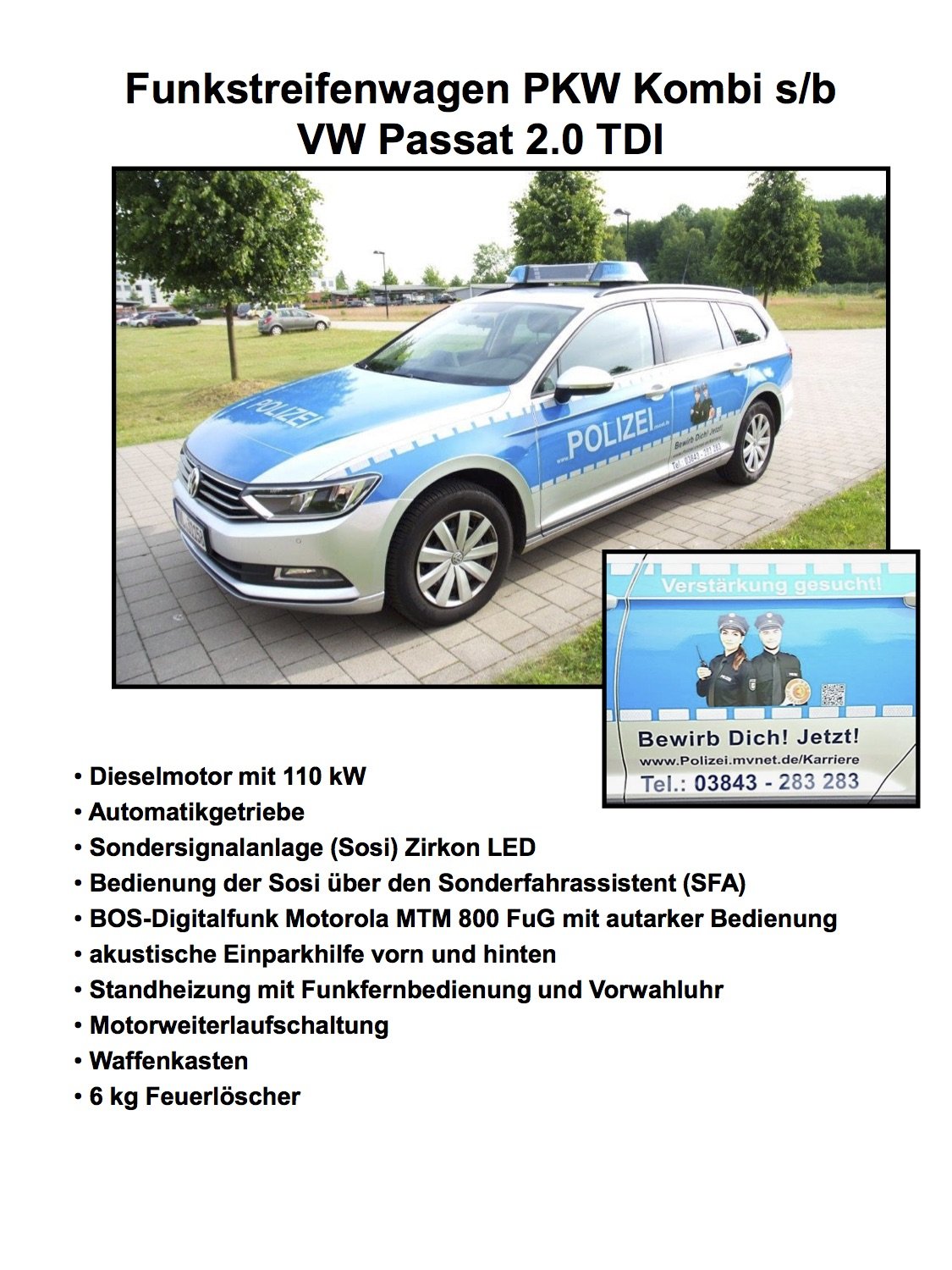 23 der neuen Funkstreifenwagen sind mit Aufklebern der Kampagne der Landespolizei zur Nachwuchsgewinnung „Verstärkung gesucht“ ausgestattet. Diese befindet sich beidseitig auf den hinteren Türen der Fahrzeuge. „Das Land braucht mehr junge und gut ausgebildete Polizistinnen und Polizisten“, so Innenminister Lorenz Caffier. “ Doch die Bewerberinnen und Bewerber müssen erst einmal gefunden werden. Die Kampagne der Landespolizei soll dabei helfen Jugendliche und junge Erwachsene für die Arbeit als Polizist zu begeistern.“