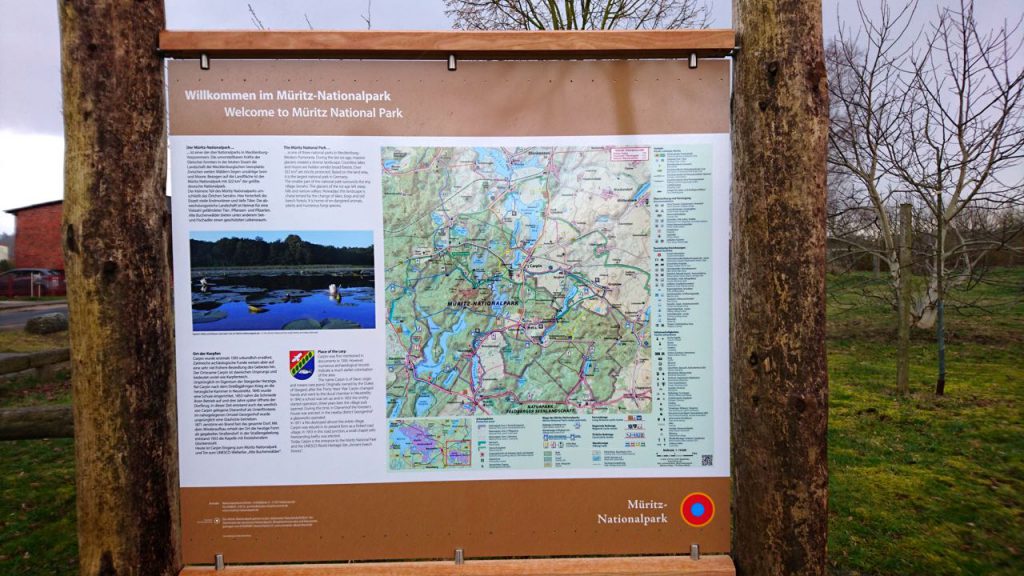 Inwieweit die neuen Tafeln auch vandalismus-beständig sind, muss sich erst noch erweisen. Hoffentlich kommen nicht ganz „Schlaue“ auf die Idee, sich solche Tafeln als „Andenken“ mitzunehmen. Auf der Rückseite sind – mehrsprachig – auch die Regeln für das Großschutzgebiet erwähnt.