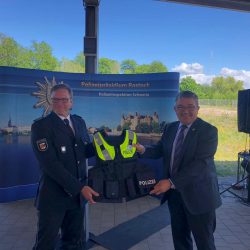 Die Polizisten in Mecklenburg-Vorpommern haben neue Schutzwesten bekommen, im Amtsdeutsch auch Außentragehüllen genannt. Innenminister Lorenz Caffier hat heute die ersten Westen, die eine verbesserte Unterbringung der Ausrüstungsgegenstände und zusätzlichen Schutz (ballistischer und Stichschutz) ermöglichen, übergeben.