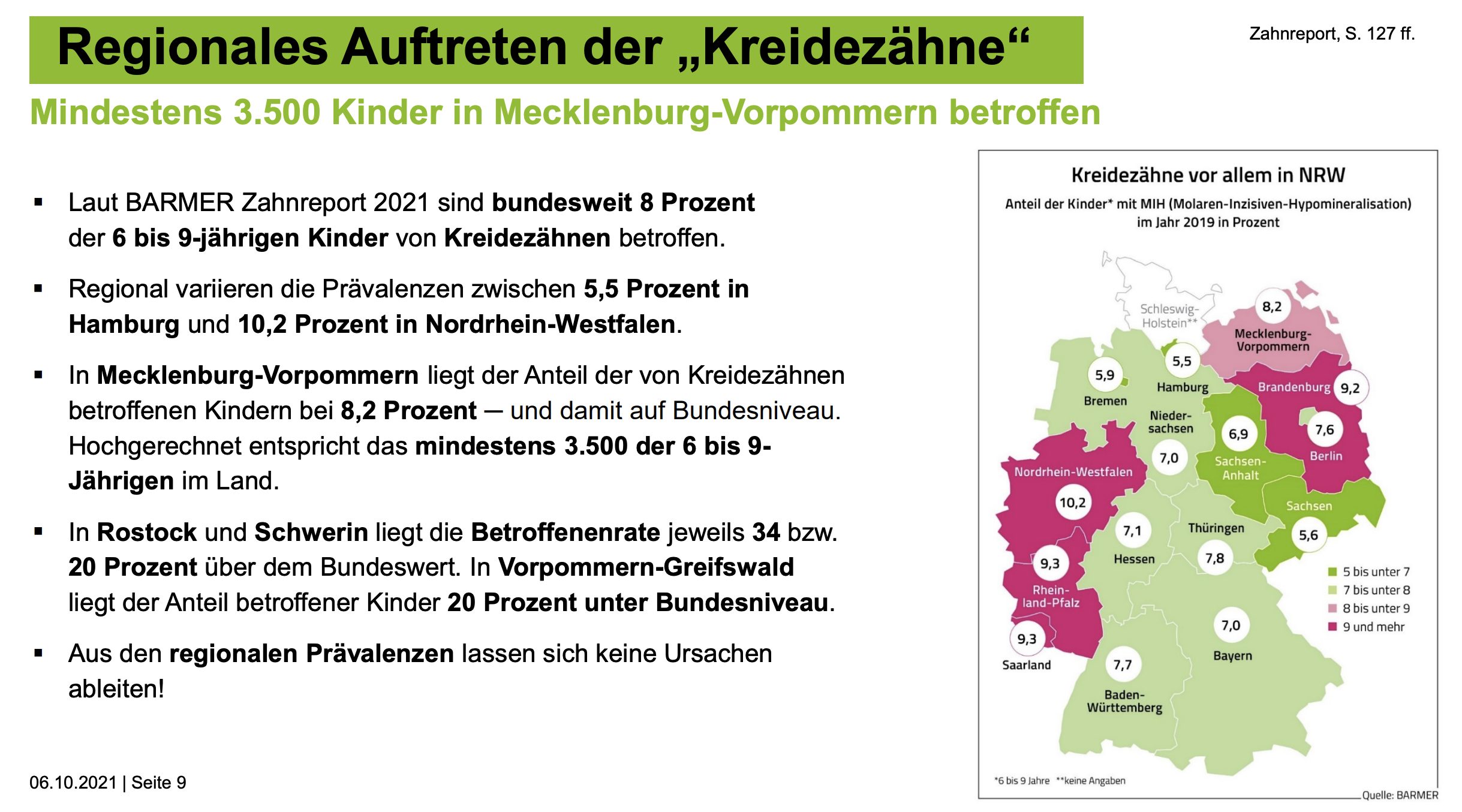 Im Fachjargon werden Kreidezähne als Molaren-Inzisiven-Hypomineralisation (MIH) beschrieben, da die Schmelzstörung typischerweise an den ersten bleibenden Backenzähnen (Molaren) und bleibenden Schneidezähnen vorkommt. Laut BARMER Zahnreport variiert das Auftreten von Kreidezähnen regional sehr stark voneinander. So liegt die Betroffenenrate bei den Sechs- bis Neunjährigen in Mecklenburg-Vorpommern mit 8,2 Prozent nur leicht über dem Bundesniveau von 8 Prozent. Die niedrigste Rate hat Hamburg mit 5,5 Prozent und Nordrhein-Westfalen die höchste mit 10,2 Prozent. Auch auf Kreisebene gibt es große Unterschiede: In Rostock sind 10,4 Prozent der Kinder in der Altersgruppe von Kreidezähnen betroffen, in Schwerin 9,4 Prozent. In Vorpommern-Greifswald ist die Betroffenenrate mit 6,2 Prozent die landesweit niedrigste. „Diese regionalen Unterschiede können wir nicht erklären“, sagt Henning Kutzbach.
