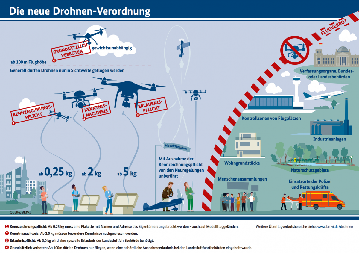 Auch an der Müritz gibt es inzwischen viele Hobby-Drohnenpiloten. Zum Betreiben von Drohnen gibt es seit dem 1. Oktober einige neue Vorschriften, die das Bundesverkehrsministerium in dieser Grafik sehr übersichtlich dargestellt hat.