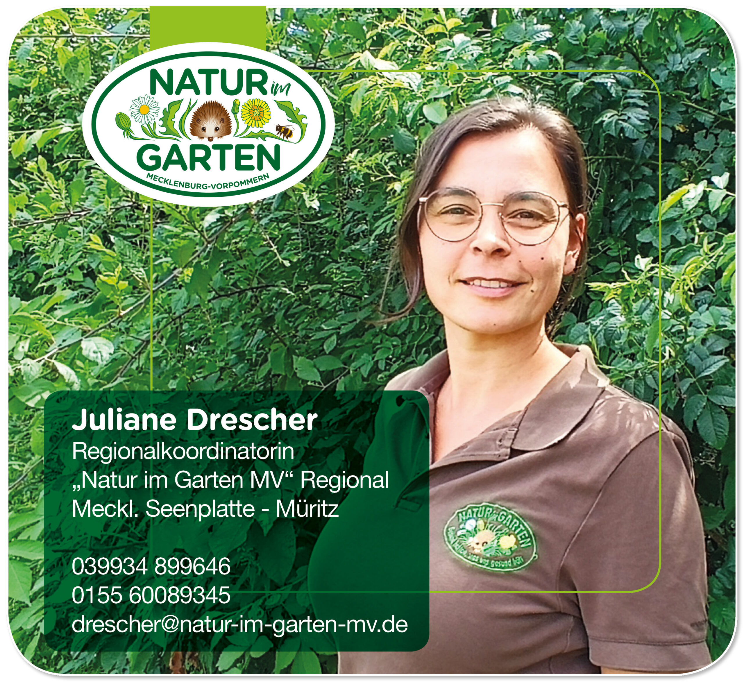 Wir freuen uns sehr, dass die Aktion „Natur im Garten“ weiter gefördert wird. Jule konnten wir bereits zur Eröffnung des Wildpflanzengarten Waren Müritz im Mai kennengelernt. Sie hat uns an diesem Tag mit informativen Broschüren, Samen und wetvollen Auskünften unterstützt. Wir wünschen ihr viele begeisterte Gärtner und Freude bei ihrer Arbeit. Wir denken allerdings auch oft an Morgana, die regelmäßig interessante Vorträge in unserem Wildgarten gehalten hat. Leider wurden die Fördergelder vor einem Jahr gestrichen, so dass sie ihre wunderbare Arbeit dadurch verlor.