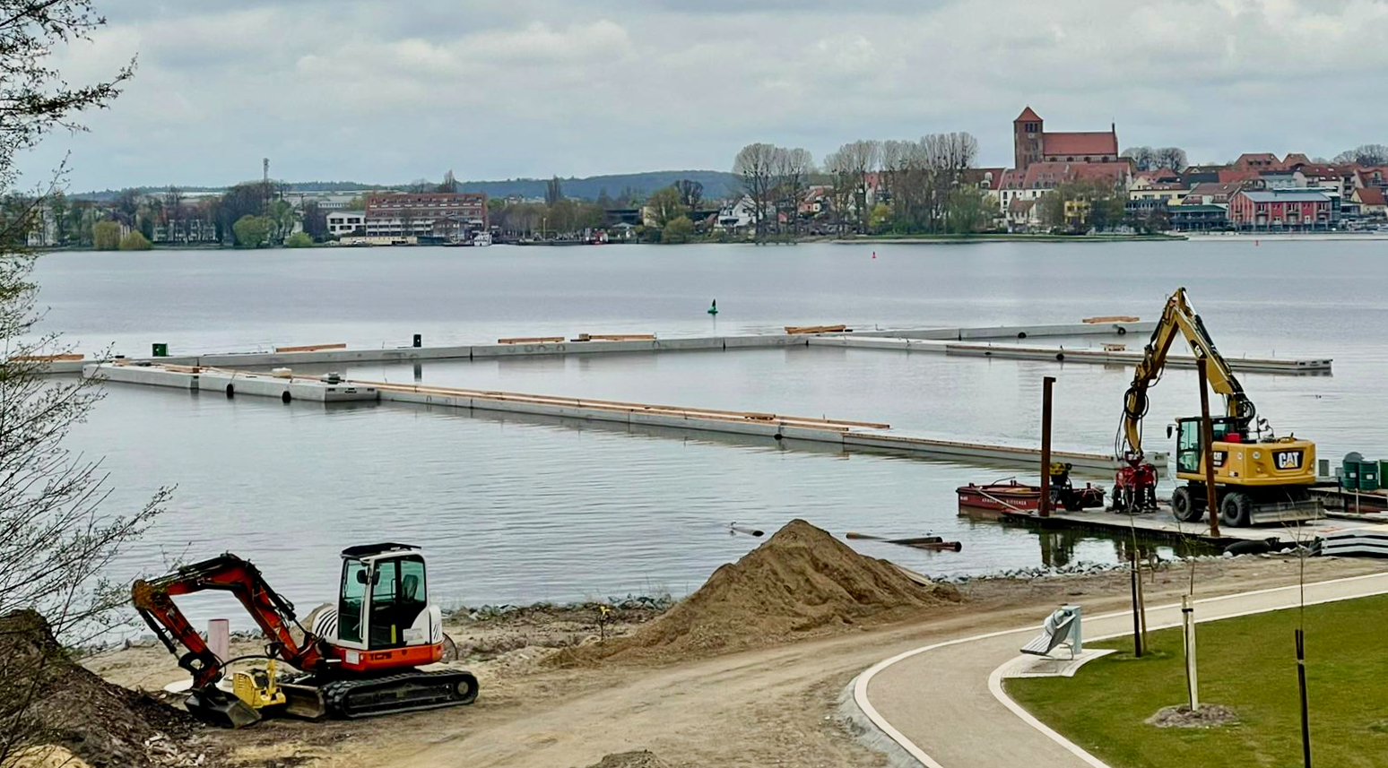 Die Bauarbeiten am neuen Hafen vor der Ferienanlage MareMüritz in Waren gehen zügig voran. Inzwischen ist die Anlage, an der es 65 Liegeplätze geben soll und die von einem einheimischen Charterunternehmen betrieben wird, schon gut zu erkennen.