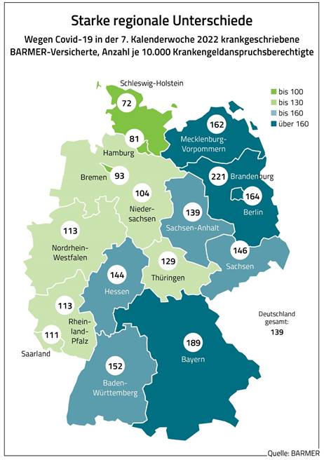 Wie aus der Analyse weiter hervorgeht, gibt es massive regionale Unterschiede bei den Krankenschreibungen aufgrund einer Covid-19-Infektion. Auf Platz zwei und drei hinter Brandenburg befanden sich Bayern und Berlin mit 189 beziehungsweise 164 je 10.000 Versicherten, die aufgrund einer Corona-Infektion krankgeschrieben waren. Schleswig-Holstein bildet das Schlusslicht. Es lag mit 72 je 10.000 Krankgeschriebenen deutlich darunter. Lediglich Hamburg und Bremen hatten mit 81 beziehungsweise 93 je 10.000 Versicherten ähnlich geringe AU-Zahlen in diesem Zeitraum.