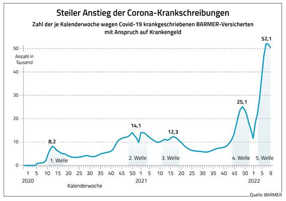 Noch nie waren so viele Menschen wegen Corona arbeitsunfähig wie aktuell. Zu diesem Ergebnis kommt eine Auswertung des BARMER Instituts für Gesundheitssystemforschung unter BARMER-versicherten Erwerbstätigen. Demnach waren in der Woche vom 13. Februar bis 19. Februar 52.100 bei der BARMER versicherte Beschäftigte wegen einer Covid-19-Infektion arbeitsunfähig. Zu den Spitzenzeiten der ersten Wellen waren es bis zu 25.100 Krankengeld-Anspruchsberechtigte, die krankgeschrieben waren. Das entspricht einer Steigerung von 108 Prozent. Im vergangenen Jahr waren es pro Woche durchschnittlich 10.430 BARMER-Versicherte mit Anspruch auf Krankengeld.