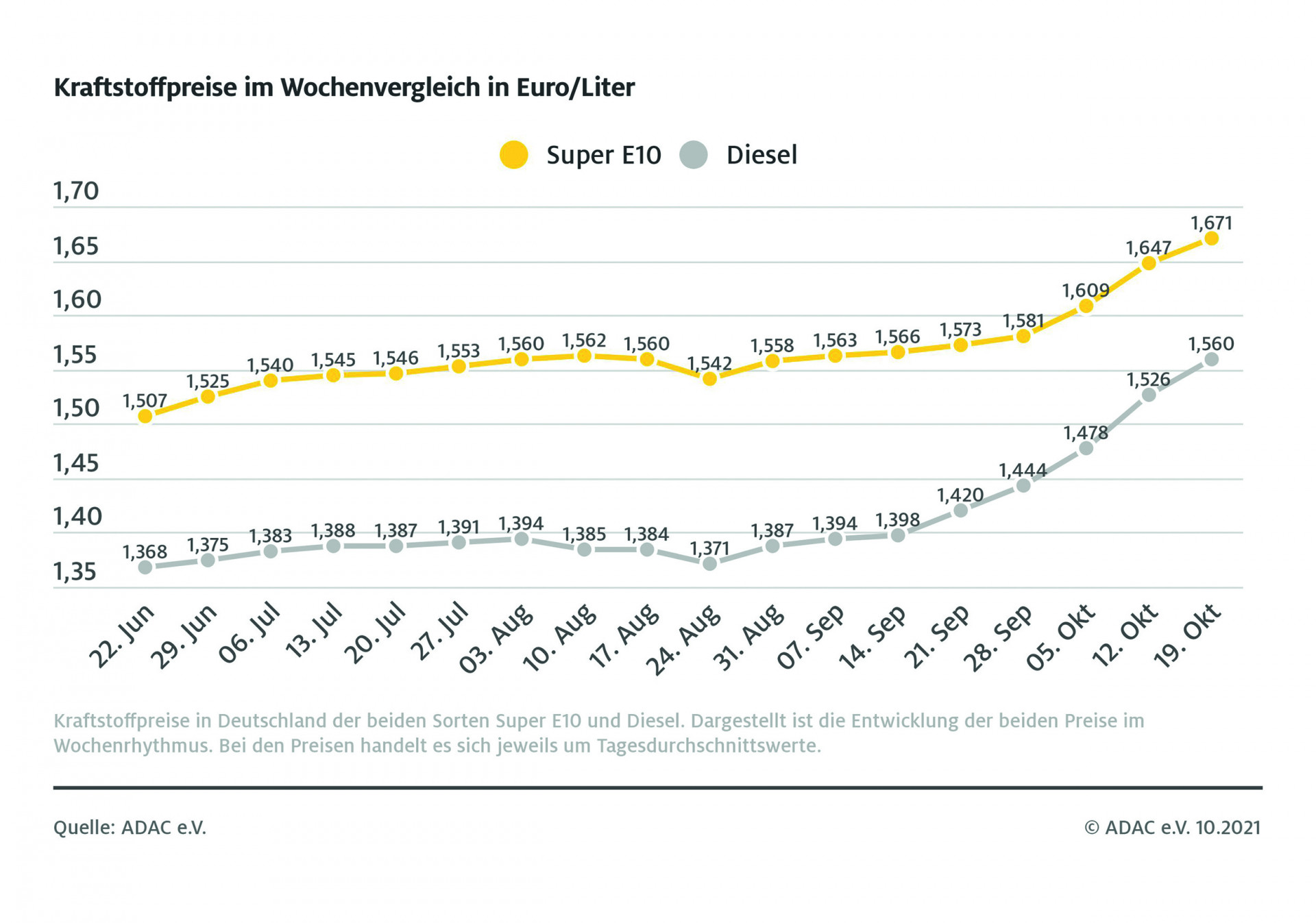 Die Spritpreise steigen weiter. Das ergibt eine aktuelle Auswertung des ADAC. Beim Diesel müssen Verbraucher sich wieder auf ein neues Allzeithoch an den Zapfsäulen einstellen: Im Bundesschnitt werden hier für einen Liter 1,560 Euro fällig – ein Anstieg von 3,4 Cent im Vergleich zur Vorwoche. Für einen Liter Super E10 ermittelt der Club in seinem Wochenvergleich einen bundesweiten Durchschnittspreis von 1,671 Euro. Das entspricht einem Anstieg von 2,4 Cent im Vergleich zur Vorwoche.