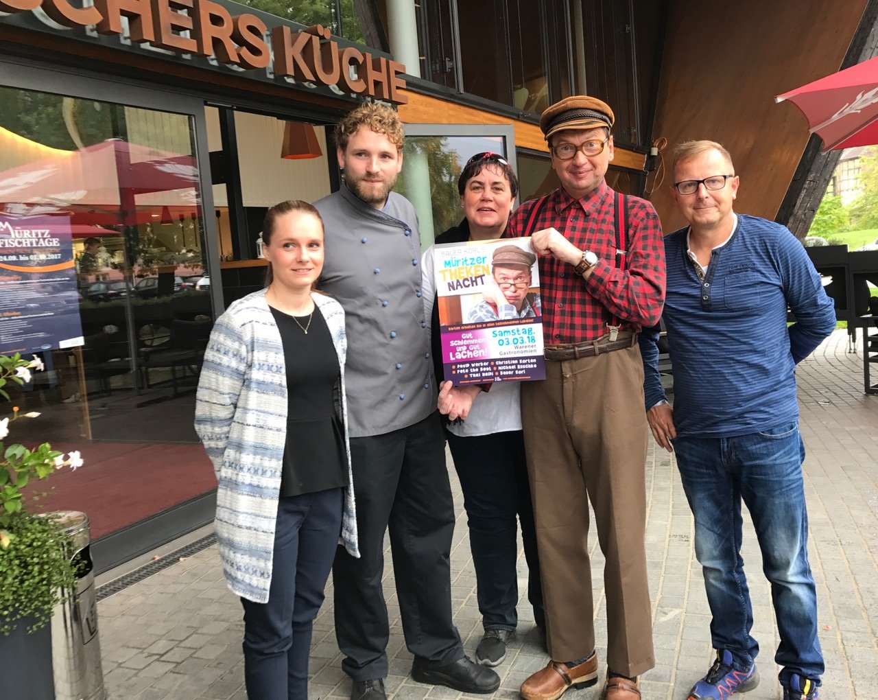 Foto unten: Veranstalter und Gastronomen präsentieren das frisch gedruckte Plakat für die erste „Müritzer Thekennacht“ am 3. März 2018