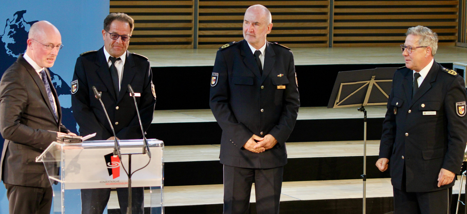 Bei der Amtseinführung waren viele Leiter der Polizeiinspektionen anwesend, dazu die Bundespolizei und Sicherheitsbeamte aus Brandenburg und der Neubrandenburger OB Silvio Witt.