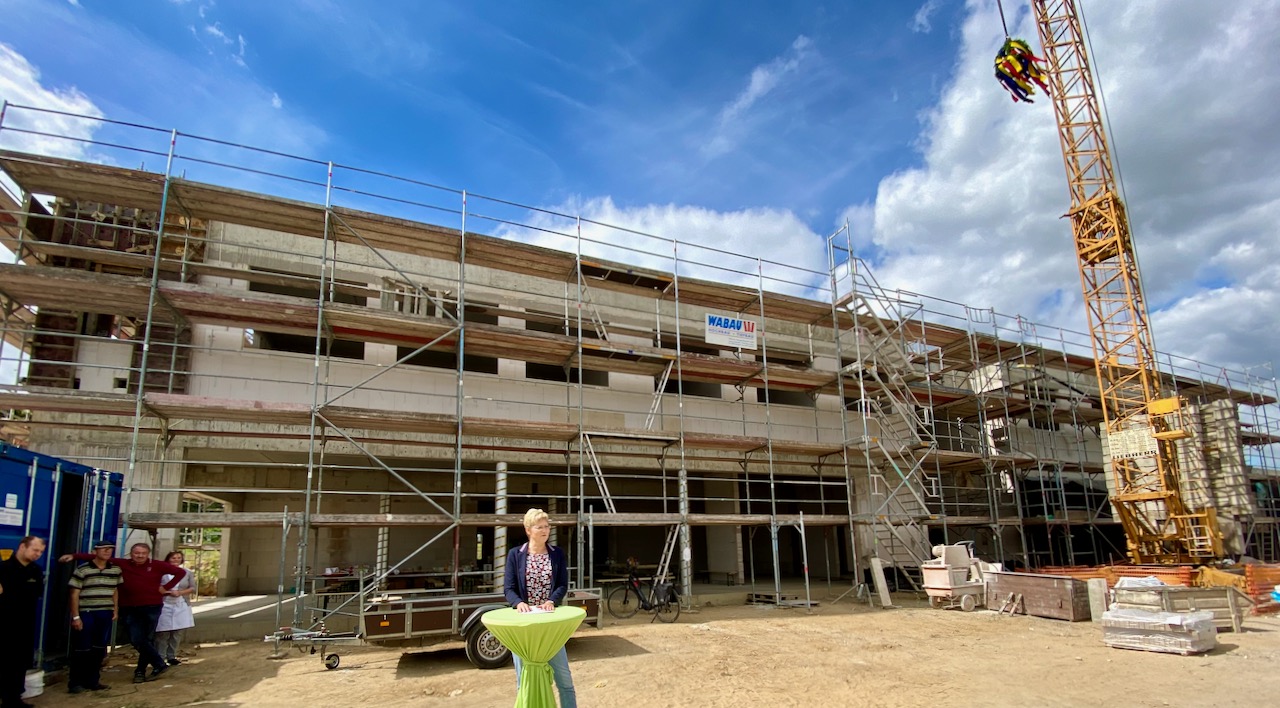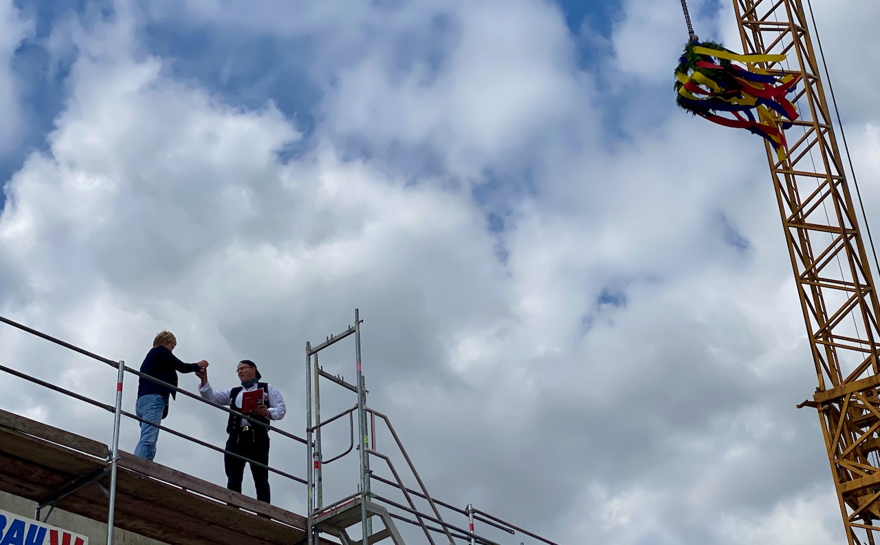 Trotz Corona keine Verzögerungen: Nach dem ersten Spatenstich Mitte Oktober vergangenen Jahres liegt die Lebenshilfswerk gGmbH mit ihrem Bauvorhaben in der Gievitzer Straße in Waren voll im Zeitplan. Das Lebenshilfswerk investiert am Rande des Gewerbegebietes Ost rund 4,2 Millionen Euro in einen Neubau mit Großküche, Kantine sowie Verwaltung (WsM berichtete). Gestern feierte Geschäftsführerin Anke Koth mit Mitarbeitern, Bauleuten, Planern und Politikern schon das Richtfest. Mit der Fertigstellung des neuen Hauses rechnet sie im April des kommenden Jahres.