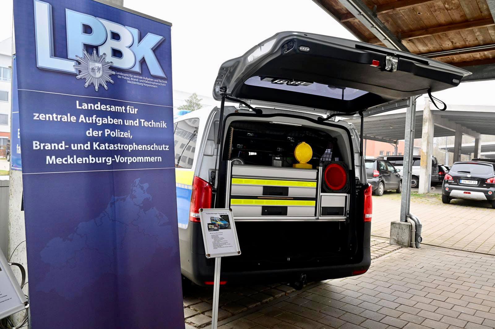 14 neue Funkstreifenwagen Transporter mit einem eigens für die Polizeiarbeit konzipierten Heckladesystem hat die Landespolizei Mecklenburg-Vorpommern erstmals in den Dienst gestellt. „Dieses neue Heckladesystem erleichtert die Arbeit für unsere Polizisten im Streifendienst“, sagte Inspekteur Wilfried Kapischke. „Auf den Funkstreifenwagen werden immer mehr Führungs- und Einsatzmittel mitgeführt. Um ein sicheres und übersichtliches Verstauen und den schnellen, unkomplizierten Zugriff zu ermöglichen, ist in Zusammenarbeit mit den Kolleginnen und Kollegen des Streifendienstes ein Verlade- und Ordnungssystem für den Kofferraum entwickelt worden.“