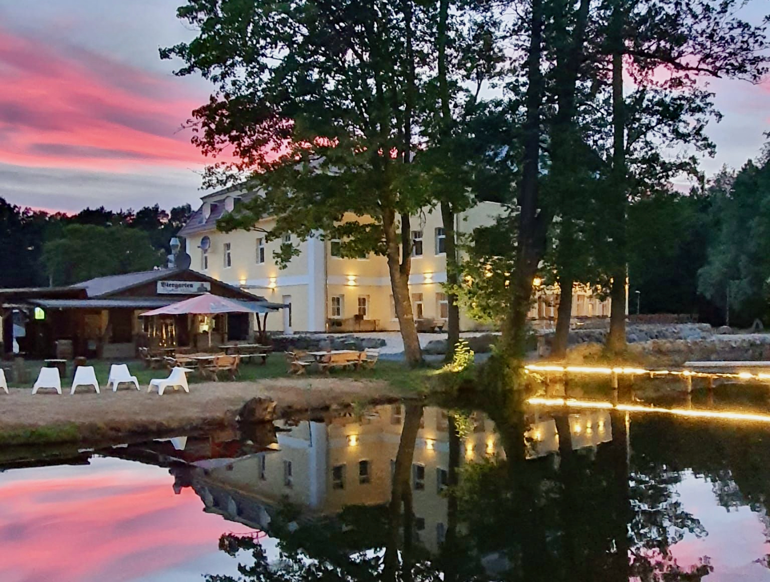 Foto: Das neue Hotel in Fleether Mühle bei Abenddämmerung © Dr. Sabine Siebert