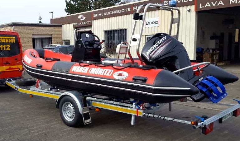 Dieses Schlauchboot gehört ab sofort zum Fuhrpark der Freiwilligen Feuerwehr in Waren. Die Kameraden haben das 5,2 Meter lange Rettungsboot mit 50-PS-Motor heute Abend während ihrer Jahreshauptversammlung offiziell bekommen.