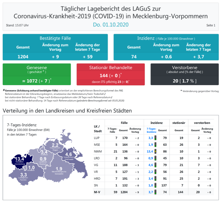 Laut einer Schätzung des Robert Koch-Instituts (RKI) sind in Mecklenburg-Vorpommern 1072 der positiv getesteten Menschen von einer Covid-19-Erkrankung genesen. Insgesamt gab es bislang 20 Todesfälle im Land.