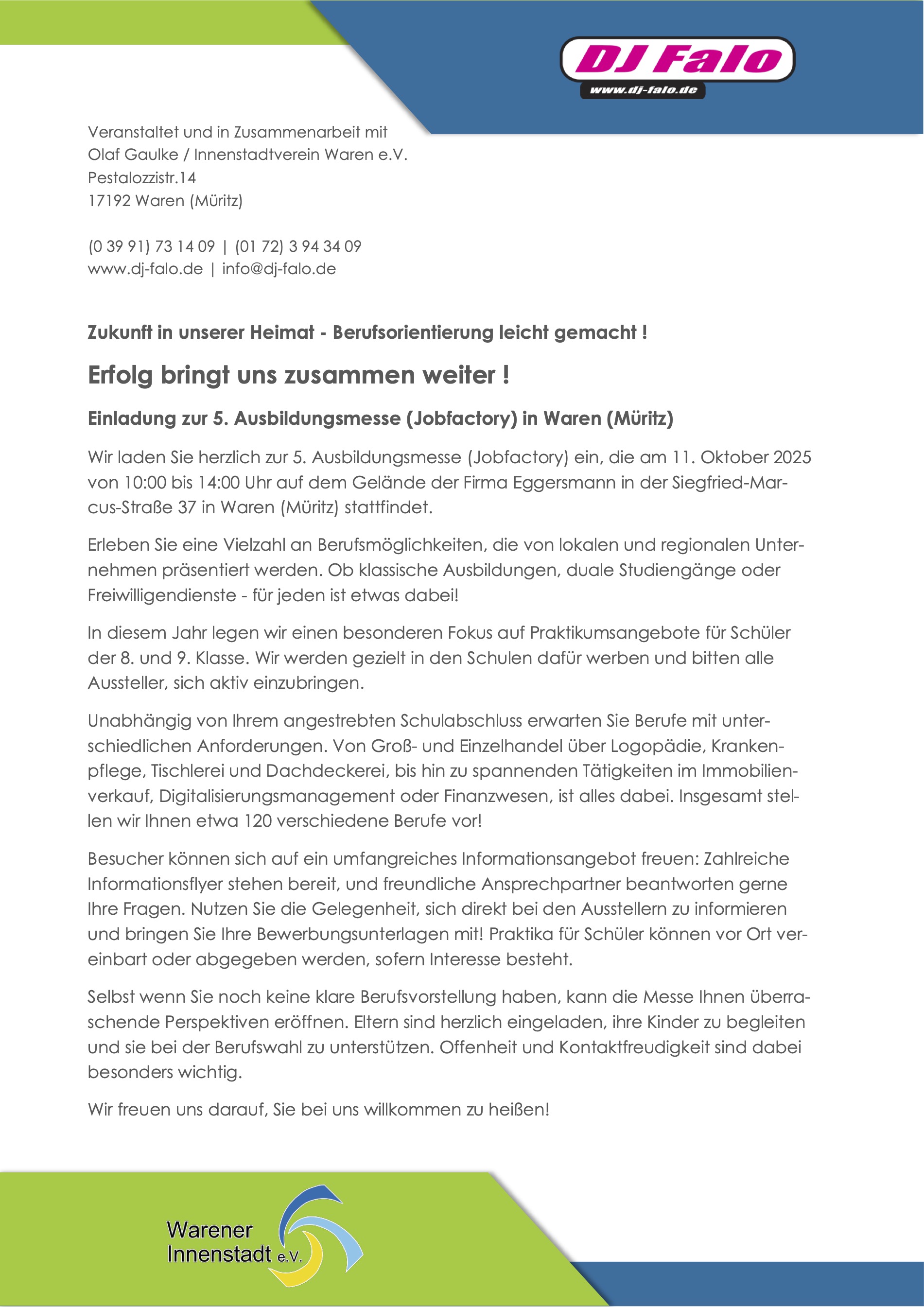 Zum fünften Mal steigt am 11. Oktober auf dem Gelände der Warener Firma Eggersmann eine große Job- und Ausbildungsmesse. Stand an Stand, zahllose Informationsflyer und freundliche, den Besuchern zugewandte Gesichter – das alles und viel mehr erwartet Schüler, Eltern und sonstige Interessenten von 10 bis 14 Uhr. Rund 40 lokale und regionale Unternehmen sind in der Siegfried-Marcus-Straße 37 dabei. Von klassischer Ausbildung, über (duales) Studium bis hin zu Freiwilligendiensten – das angebotene Spektrum reicht weit. Dabei spielt es auch keine Rolle, welche Art von Schulabschluss angestrebt wird, da verschiedene Ausbildungsberufe mit ebenso unterschiedlichen Voraussetzungen präsentiert werden. Auch, wer einen Praktikumsplatz sucht, ist bei der Messe genau richtig. Noch können sich Unternehmen für die Messe, die von Olaf Gaulke und dem Innenstadtverein Waren organisiert wird, anmelden, um sich am 11. Oktober zu präsentieren und junge Menschen von sich zu überzeugen.