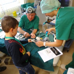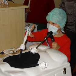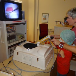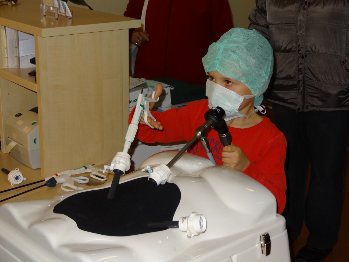 Die kleinen Besucher 12des Müritz-Klinikums konnten aber auch selbst ausprobieren, ob ihnen das Operieren liegt. Zumindest das minimalinvasive. Da entpuppte sich heute das eine oder andere Nachwuchs-Talent, denn die bunten Smarties angelten sich alle Mädchen und Jungen ziemlich fix mit den chirurgischen Instrumenten aus dem eigentlich unübersichtlichen“Bauchraum“.
