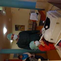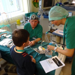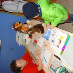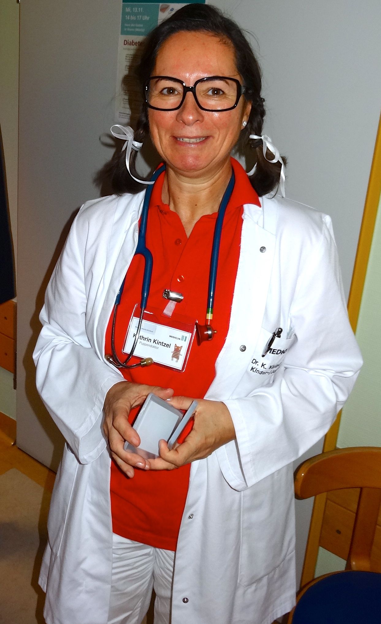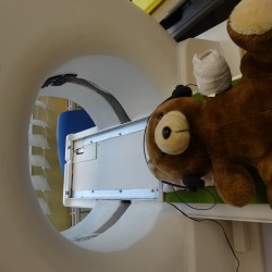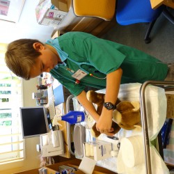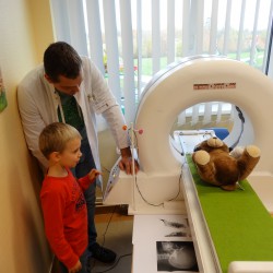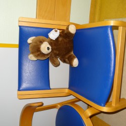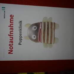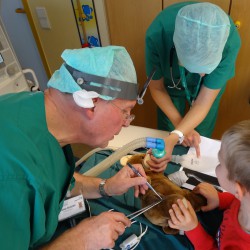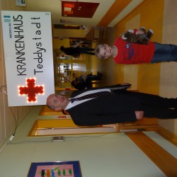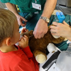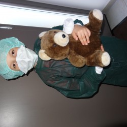 Nach einer eingehenden Untersuchung durch den Kinderarzt, der in diesem Fall wenig größer war als Jonathan, schaute auch „Frau Puppendoktor Pille mit der großen klugen Brille“ auf den Patienten. Außerdem musste er ein MRT über sich ergehen lassen, ehe die Anästhesistin die Narkose einleitete und ein Chirurg die Wunde nähen konnte. Inzwischen geht’s dem Teddy wieder richtig gut. Auch dank der leckeren Medizin…
