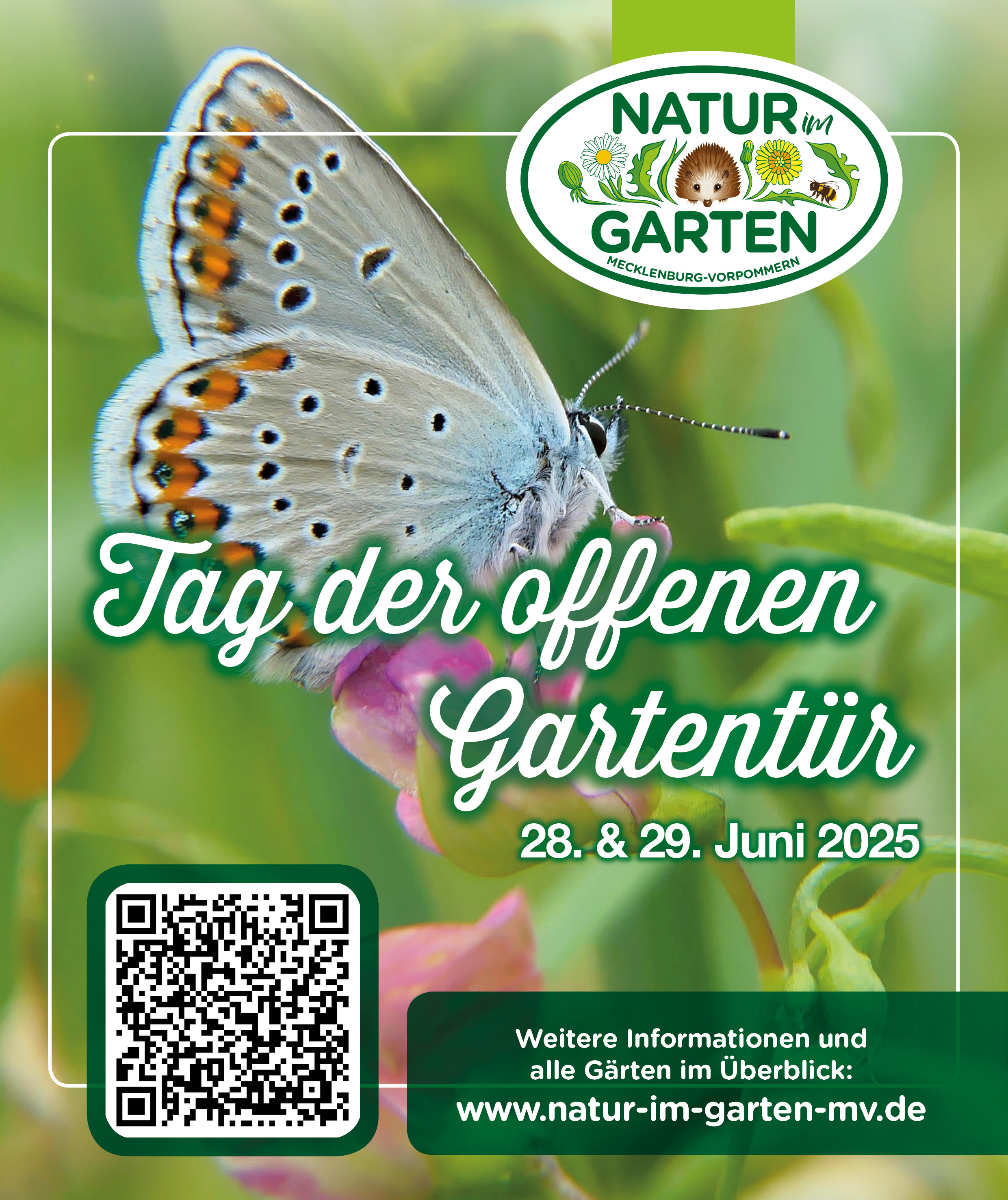 Der „Tag der offenen Gartentür“ in Mecklenburg-Vorpommern ist eine jährliche Veranstaltung, die vom Projekt „Natur im Garten MV“ organisiert wird. Sie findet traditionell am letzten Juni-Wochenende anlässlich des Internationalen „Natur im Garten“-Tages statt und öffnet die Türen von Gärten, die mit der „Natur im Garten“-Gartenplakette ausgezeichnet sind. Diese Auszeichnung erhalten Gärten, die ohne den Einsatz von chemisch-synthetischen Pflanzenschutzmitteln, Dünger und Torf gepflegt werden und stattdessen auf biologische Vielfalt und naturnahe Gestaltung setzen. Die teilnehmenden Gärten bieten Einblicke in naturnahe und klimafitte Gartengestaltungen, ökologische Pflege und die Förderung der biologischen Vielfalt.