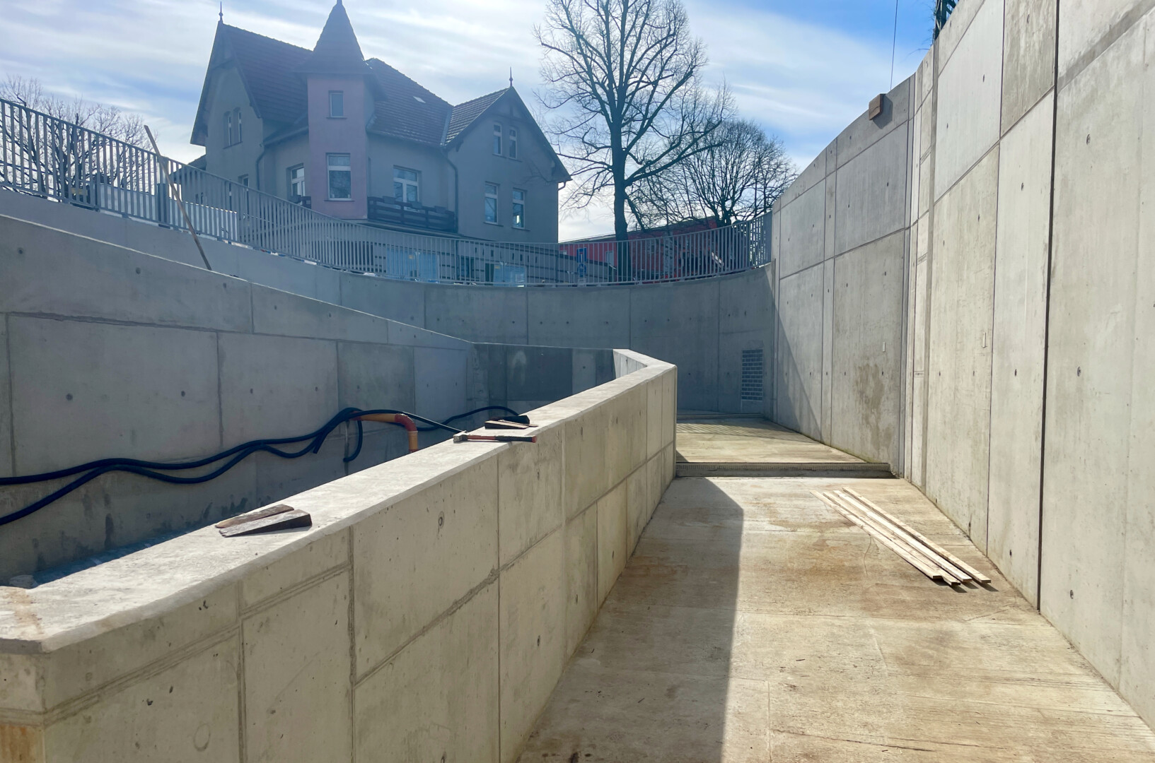 Die Rampenanlage auf der Ostseite der Unterführung, also auf der Bahnhofsseite, wird in zwei Abschnitten erbaut. Der südliche Abschnitt ist im Rohbau fertiggestellt, die Treppenanlage des südlichen Abschnittes dient bis zur Gesamtinbetriebnahme der Treppen- und Rampenanlage als provisorische Führung der Reisegäste. Die müssen momentan zwar etwas suchen, bis sie die Treppe und damit den Eingang zum Tunnel gefunden haben, aber gerade bei Warenern, die häufig mit dem Zug unterwegs sind, überwiegt die Freude auf den neuen Tunnel.