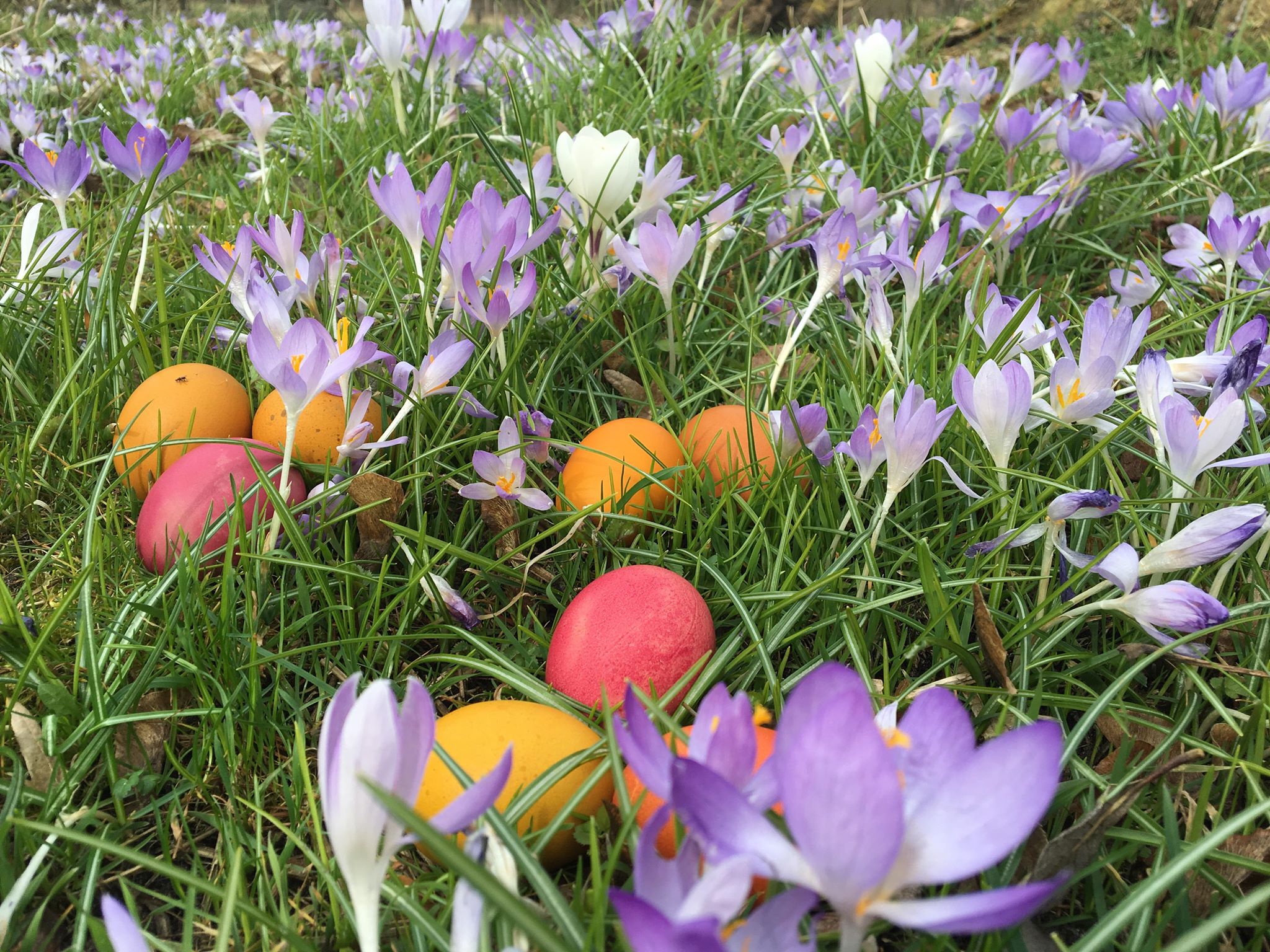 Rottöne lassen sich etwa mit rotem Malventee oder mit Apfelbaum- oder Birkenrinde erreichen, rote Bete oder Rotkohl ergeben ein Rotviolett, Heidel- oder Holunderbeeren – auch deren aufgekochter Saft – färben das Ei graublau, Möhren blassorange, Efeu, Ackerschachtelhalm, Spinat oder Petersilie erzeugen Grüntöne. Zwiebelschalen, aufgekochter Kaffee oder Tee ergeben Braun-, Kurkuma, Kamillenblüten oder Matetee Gelbtöne. Zum Schluss jedes Ei mit ein paar Tropfen Speiseöl polieren, fertig!