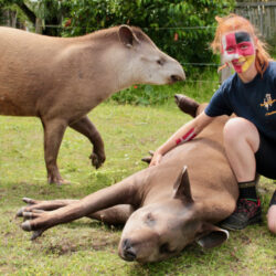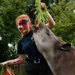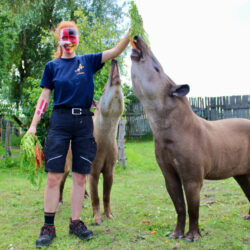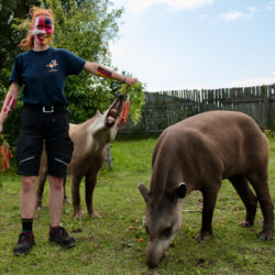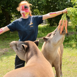 „Da die beiden Tapire beim letzten Mal nicht ganz richtig lagen, haben wir sie vorher noch einmal extra betüdelt, um sie auf ihre verantwortungsvolle Aufgabe einzustimmen. Schließlich haben sie sich vor dem letzten Spiel ein bisschen vertan, den Gruppensieger zwar richtig vorhergesagt, aber eben nicht den Sieger des Spiels. Das Streicheln, Kuscheln und Schmusen fanden die beiden Tapire dann so toll, dass sie nach ihrer Pflicht, also nach dem Orakeln, gleich wieder in den Kuschelmodus übergegangen sind“, berichtet Tierpfleger David Fuhlbrügge.