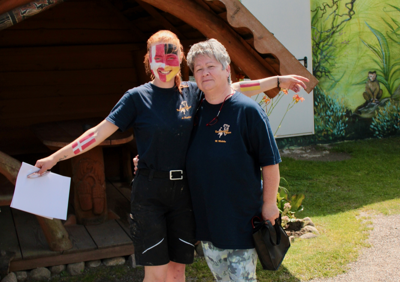Marita Michelus hat das heutige Model Laura Kapellner aufwendig geschminkt. Jeweils zur Hälfte wurde ihr Gesicht mit der Dänemark-, und der Deutschland-Flagge bemalt. Natürlich haben Pablo und Miriam die Karotten schon von weitem erschnuppert und sind zielstrebig auf Laura zugelaufen. Dieses Mal waren sie sich allerdings nicht gleich einig, welche Seite ihnen besser gefällt. Zum Glück entschieden sich die knuffigen Rüsselnasen aber für die deutsche Seite.