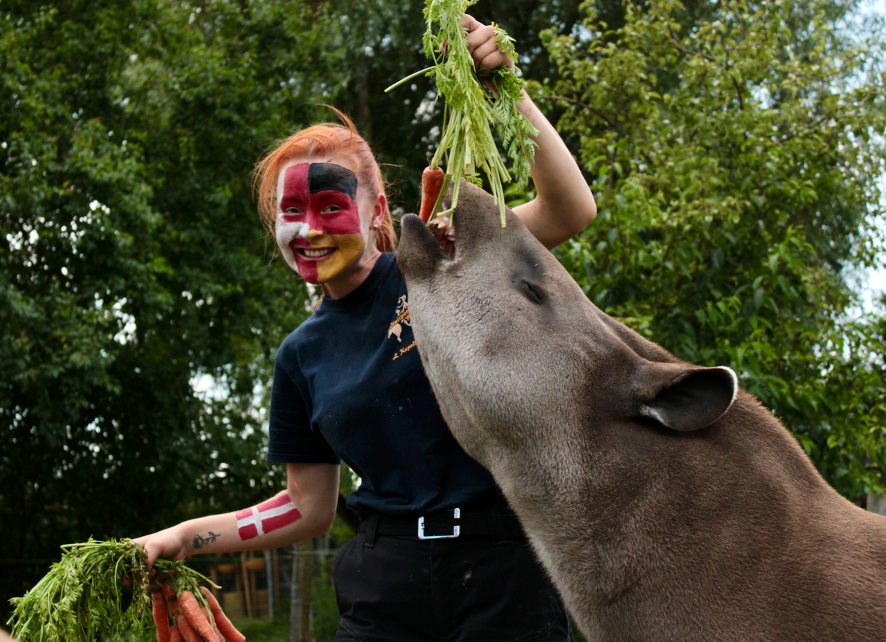 „Da die beiden Tapire beim letzten Mal nicht ganz richtig lagen, haben wir sie vorher noch einmal extra betüdelt, um sie auf ihre verantwortungsvolle Aufgabe einzustimmen. Schließlich haben sie sich vor dem letzten Spiel ein bisschen vertan, den Gruppensieger zwar richtig vorhergesagt, aber eben nicht den Sieger des Spiels. Das Streicheln, Kuscheln und Schmusen fanden die beiden Tapire dann so toll, dass sie nach ihrer Pflicht, also nach dem Orakeln, gleich wieder in den Kuschelmodus übergegangen sind“, berichtet Tierpfleger David Fuhlbrügge.