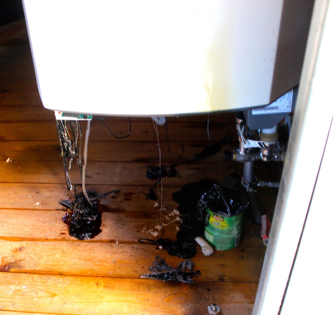 Und tatsächlich, gleich neben der Tür schmorten die Kabel eines Wasserboilers vor sich hin. Das Innere des Hauses war schon verqualmt.