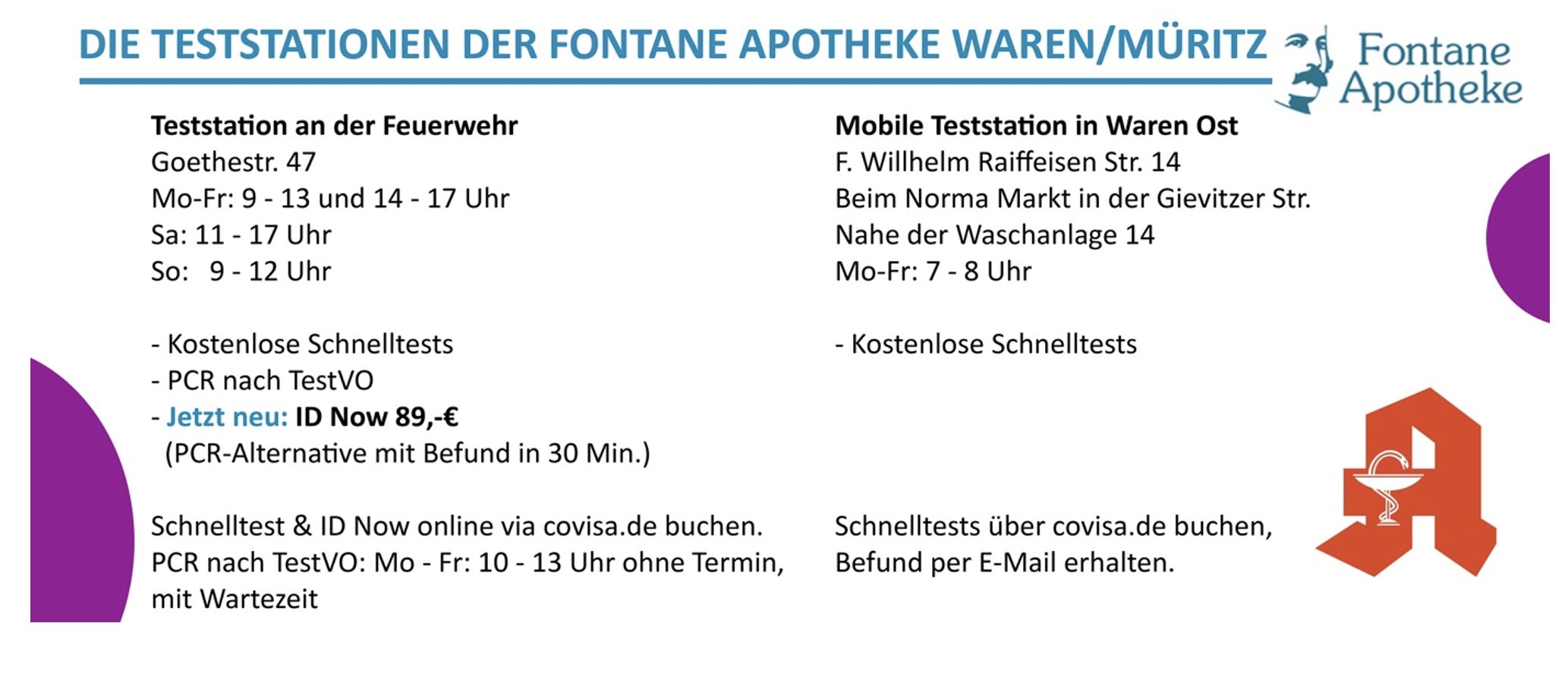 In Waren Ost werden in der Woche morgens zwischen 7-8 Uhr weiterhin Schnelltests durchgeführt. Die Anmeldung erfolgt ausschließlich über covisa.de. PCR-Testung ist hier leider nicht möglich. Die Teststation befindet sich in der Nähe des Norma-Marktes neben der Waschanlage in der Friedrich-Wilhelm-Raiffeisenstraße.