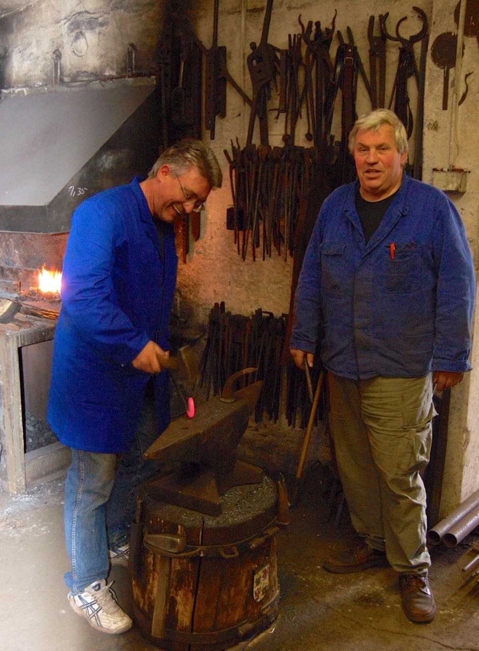 Foto: Uwe Böttcher zeigt einem „Schmiedeschüler“ sein Handwerk.